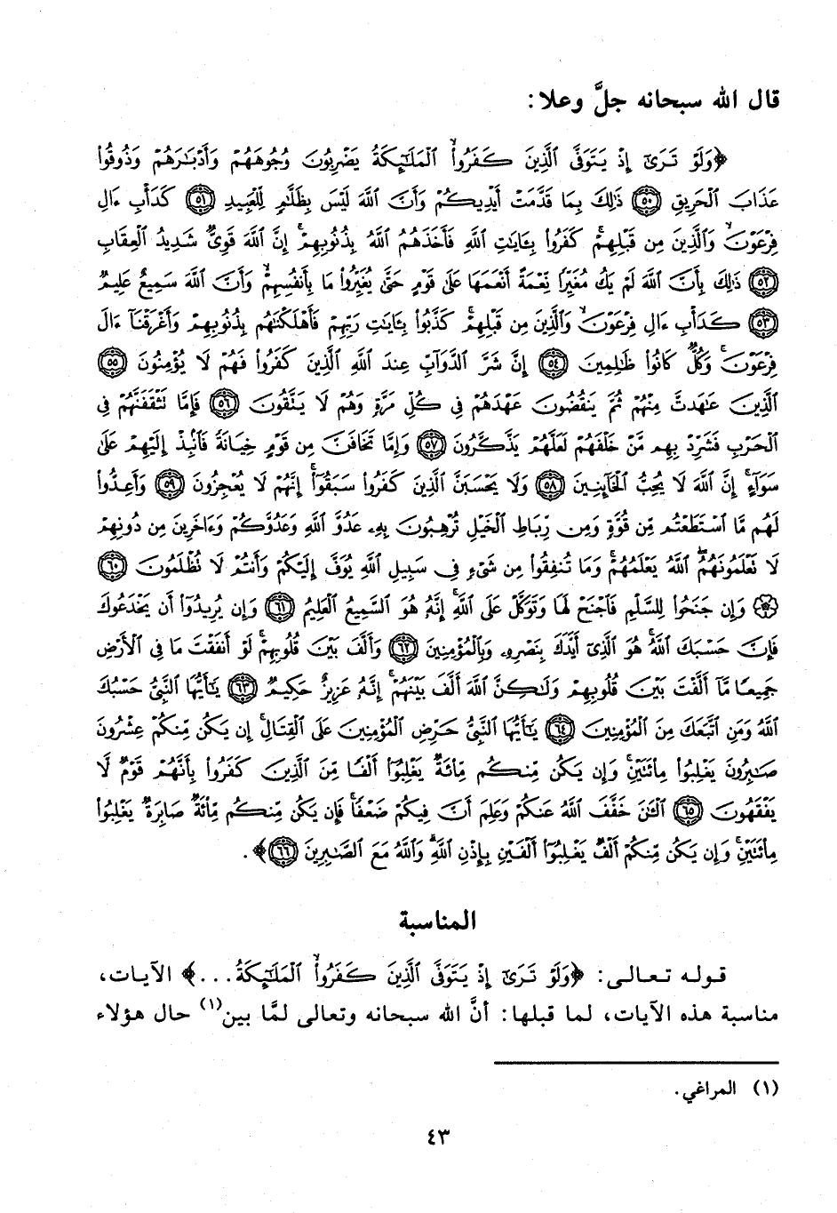 {وَلَوْ تَرَى إِذْ يَتَوَفَّى الَّذِينَ كَفَرُوا الْمَلَائِكَةُ يَضْرِبُونَ وُجُوهَهُمْ وَأَدْبَارَهُمْ وَذُوقُوا عَذَابَ الْحَرِيقِ (50) ذَلِكَ بِمَا قَدَّمَتْ أَيْدِيكُمْ وَأَنَّ اللَّهَ لَيْسَ بِظَلَّامٍ لِلْعَبِيدِ (51) كَدَأْبِ آلِ فِرْعَوْنَ وَالَّذِينَ مِنْ قَبْلِهِمْ كَفَرُوا بِآيَاتِ اللَّهِ فَأَخَذَهُمُ اللَّهُ بِذُنُوبِهِمْ إِنَّ اللَّهَ قَوِيٌّ شَدِيدُ الْعِقَابِ (52) ذَلِكَ بِأَنَّ اللَّهَ لَمْ يَكُ مُغَيِّرًا نِعْمَةً أَنْعَمَهَا عَلَى قَوْمٍ حَتَّى يُغَيِّرُوا مَا بِأَنْفُسِهِمْ وَأَنَّ اللَّهَ سَمِيعٌ عَلِيمٌ (53) كَدَأْبِ آلِ فِرْعَوْنَ وَالَّذِينَ مِنْ قَبْلِهِمْ كَذَّبُوا بِآيَاتِ رَبِّهِمْ فَأَهْلَكْنَاهُمْ بِذُنُوبِهِمْ وَأَغْرَقْنَا آلَ فِرْعَوْنَ وَكُلٌّ كَانُوا ظَالِمِينَ (54) إِنَّ شَرَّ الدَّوَابِّ عِنْدَ اللَّهِ الَّذِينَ كَفَرُوا فَهُمْ لَا يُؤْمِنُونَ (55) الَّذِينَ عَاهَدْتَ مِنْهُمْ ثُمَّ يَنْقُضُونَ عَهْدَهُمْ فِي كُلِّ مَرَّةٍ وَهُمْ لَا يَتَّقُونَ (56) فَإِمَّا تَثْقَفَنَّهُمْ فِي الْحَرْبِ فَشَرِّدْ بِهِمْ مَنْ خَلْفَهُمْ لَعَلَّهُمْ يَذَّكَّرُونَ (57) وَإِمَّا تَخَافَنَّ مِنْ قَوْمٍ خِيَانَةً فَانْبِذْ إِلَيْهِمْ عَلَى سَوَاءٍ إِنَّ اللَّهَ لَا يُحِبُّ الْخَائِنِينَ (58) وَلَا يَحْسَبَنَّ الَّذِينَ كَفَرُوا سَبَقُوا إِنَّهُمْ لَا يُعْجِزُونَ (59) وَأَعِدُّوا لَهُمْ مَا اسْتَطَعْتُمْ مِنْ قُوَّةٍ وَمِنْ رِبَاطِ الْخَيْلِ تُرْهِبُونَ بِهِ عَدُوَّ اللَّهِ وَعَدُوَّكُمْ وَآخَرِينَ مِنْ دُونِهِمْ لَا تَعْلَمُونَهُمُ اللَّهُ يَعْلَمُهُمْ وَمَا تُنْفِقُوا مِنْ شَيْءٍ فِي سَبِيلِ اللَّهِ يُوَفَّ إِلَيْكُمْ وَأَنْتُمْ لَا تُظْلَمُونَ (60) وَإِنْ جَنَحُوا لِلسَّلْمِ فَاجْنَحْ لَهَا وَتَوَكَّلْ عَلَى اللَّهِ إِنَّهُ هُوَ السَّمِيعُ الْعَلِيمُ (61) وَإِنْ يُرِيدُوا أَنْ يَخْدَعُوكَ فَإِنَّ حَسْبَكَ اللَّهُ هُوَ الَّذِي أَيَّدَكَ بِنَصْرِهِ وَبِالْمُؤْمِنِينَ (62) وَأَلَّفَ بَيْنَ قُلُوبِهِمْ لَوْ أَنْفَقْتَ مَا فِي الْأَرْضِ جَمِيعًا مَا أَلَّفْتَ بَيْنَ قُلُوبِهِمْ وَلَكِنَّ اللَّهَ أَلَّفَ بَيْنَهُمْ إِنَّهُ عَزِيزٌ حَكِيمٌ (63) يَا أَيُّهَا النَّبِيُّ حَسْبُكَ اللَّهُ وَمَنِ اتَّبَعَكَ مِنَ الْمُؤْمِنِينَ (64) يَا أَيُّهَا النَّبِيُّ حَرِّضِ الْمُؤْمِنِينَ عَلَى الْقِتَالِ إِنْ يَكُنْ مِنْكُمْ عِشْرُونَ صَابِرُونَ يَغْلِبُوا مِائَتَيْنِ وَإِنْ يَكُنْ مِنْكُمْ مِائَةٌ يَغْلِبُوا أَلْفًا مِنَ الَّذِينَ كَفَرُوا بِأَنَّهُمْ قَوْمٌ لَا يَفْقَهُونَ (65) الْآنَ خَفَّفَ اللَّهُ عَنْكُمْ وَعَلِمَ أَنَّ فِيكُمْ ضَعْفًا فَإِنْ يَكُنْ مِنْكُمْ مِائَةٌ صَابِرَةٌ يَغْلِبُوا مِائَتَيْنِ وَإِنْ يَكُنْ مِنْكُمْ أَلْفٌ يَغْلِبُوا أَلْفَيْنِ بِإِذْنِ اللَّهِ وَاللَّهُ مَعَ الصَّابِرِينَ (66)}.