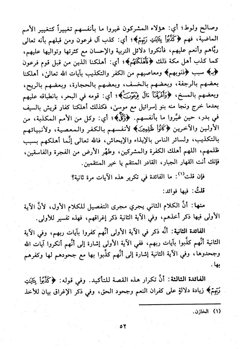 الفائدة الثالثة: أنَّ تكرار هذه القصة للتأكيد. وفي قوله: {كَذَّبُوا بِآيَاتِ رَبِّهِمْ} زيادة دلالةٍ على كفران النعم وجحود الحق، وفي ذكر الإغراق بيان للأخذ
