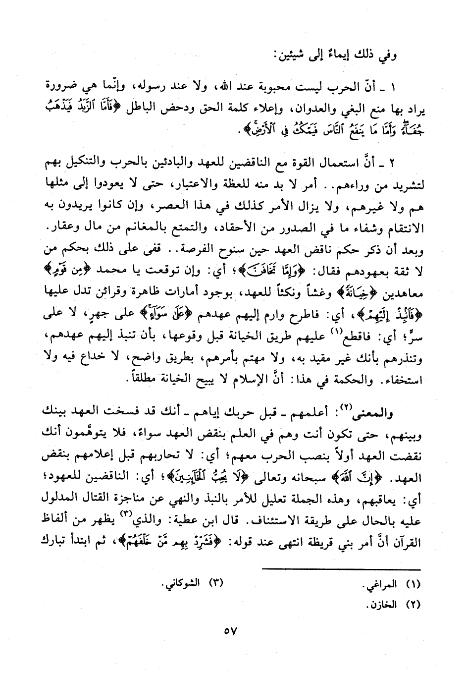 58 - وبعد أن ذكر حكم ناقض العهد حين سنوح الفرصة .. قفى على ذلك بحكم من لا ثقة بعهودهم فقال: {وَإِمَّا تَخَافَنَّ}؛ أي: وإن توقعت يا محمَّد {مِنْ قَوْمٍ} معاهدين {خِيَانَةً} وغشًّا ونكثًا للعهد، بوجود أمارات ظاهرة وقرائن تدل عليها {انْبِذْ إِلَيْهِمْ}، أي: فاطرح وارم إليهم عهدهم {عَلَى سَوَاءٍ} على جهرٍ، لا على سرٍّ؛ أي: فاقطع (¬1) عليهم طريق الخيانة قبل وقوعها، بأن تنبذ إليهم عهدهم، وتنذرهم بأنك غير مقيد به، ولا مهتم بأمرهم، بطريق واضح، لا خداع فيه ولا استخفاء. والحكمة في هذا: أنَّ الإِسلام لا يبيح الخيانة مطلقًا.