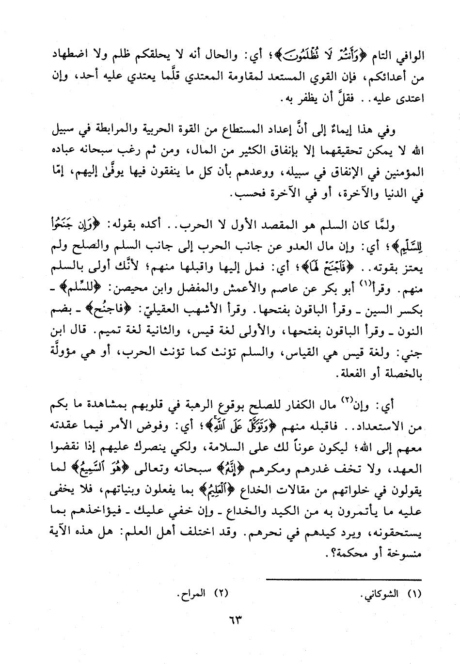 61 - ولمَّا كان السلم هو المقصد الأول لا الحرب .. أكده بقوله: {وَإِنْ جَنَحُوا لِلسَّلْمِ}؛ أي: وإن مال العدو عن جانب الحرب إلى جانب السلم والصلح ولم يعتز بقوته .. {فَاجْنَحْ لَهَا}؛ أي: فمل إليها واقبلها منهم؛ لأنَّك أولى بالسلم منهم. وقرأ (¬1) أبو بكر عن عاصم والأعمش والمفضل وابن محيصن: {لِلسَّلْمِ} - بكسر السين - وقرأ الباقون بفتحها. وقرأ الأشهب العقيليّ: {فَاجْنَحْ} - بضم النون - وقرأ الباقون بفتحها، والأولى لغة قيس، والثانية لغة تميم. قال ابن جني: ولغة قيس هي القياس، والسلم تؤنث كما تؤنث الحرب، أو هي مؤولَّة بالخصلة أو الفعلة.