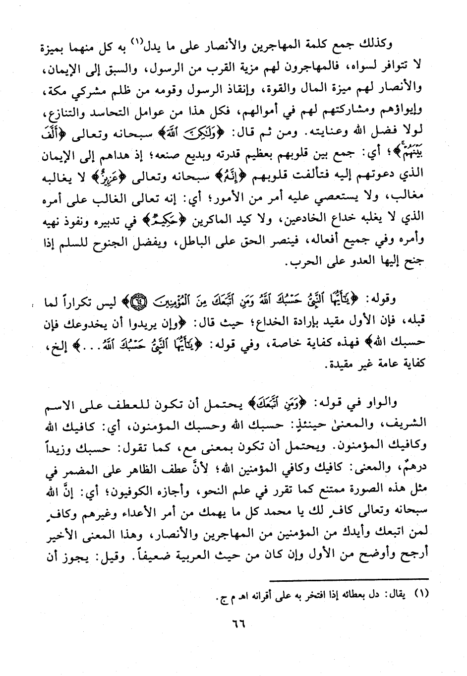 64 - وقوله: {يَا أَيُّهَا النَّبِيُّ حَسْبُكَ اللَّهُ وَمَنِ اتَّبَعَكَ مِنَ الْمُؤْمِنِينَ} ليس تكرارًا لما قبله، فإن الأول مقيد بإرادة الخداع؛ حيث قال: {وإن يريدوا أن يخدوعك فإن حسبك الله} فهذه كفاية خاصة، وفي قوله: {يَا أَيُّهَا النَّبِيُّ حَسْبُكَ اللَّهُ ...} إلخ، كفاية عامة غير مقيدة.