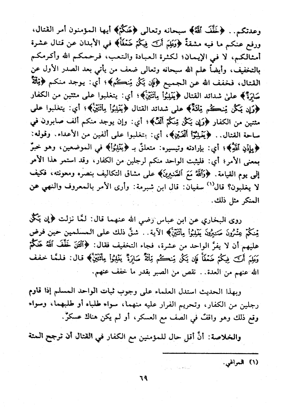 روى البخاري عن ابن عباس رضي الله عنهما قال: لمَّا نزلت {إِنْ يَكُنْ مِنْكُمْ عِشْرُونَ صَابِرُونَ يَغْلِبُوا مِائَتَيْنِ} الآية .. شقَّ ذلك على المسليمن حين فرض عليهم أن لا يفرَّ الواحد من عشرة، فجاء التخفيف فقال: {الْآنَ خَفَّفَ اللَّهُ عَنْكُمْ وَعَلِمَ أَنَّ فِيكُمْ ضَعْفًا فَإِنْ يَكُنْ مِنْكُمْ مِائَةٌ صَابِرَةٌ يَغْلِبُوا مِائَتَيْنِ} قال: فلمَّا خفف الله عنهم من العدة .. نقص من الصبر بقدر ما خفف عنهم.