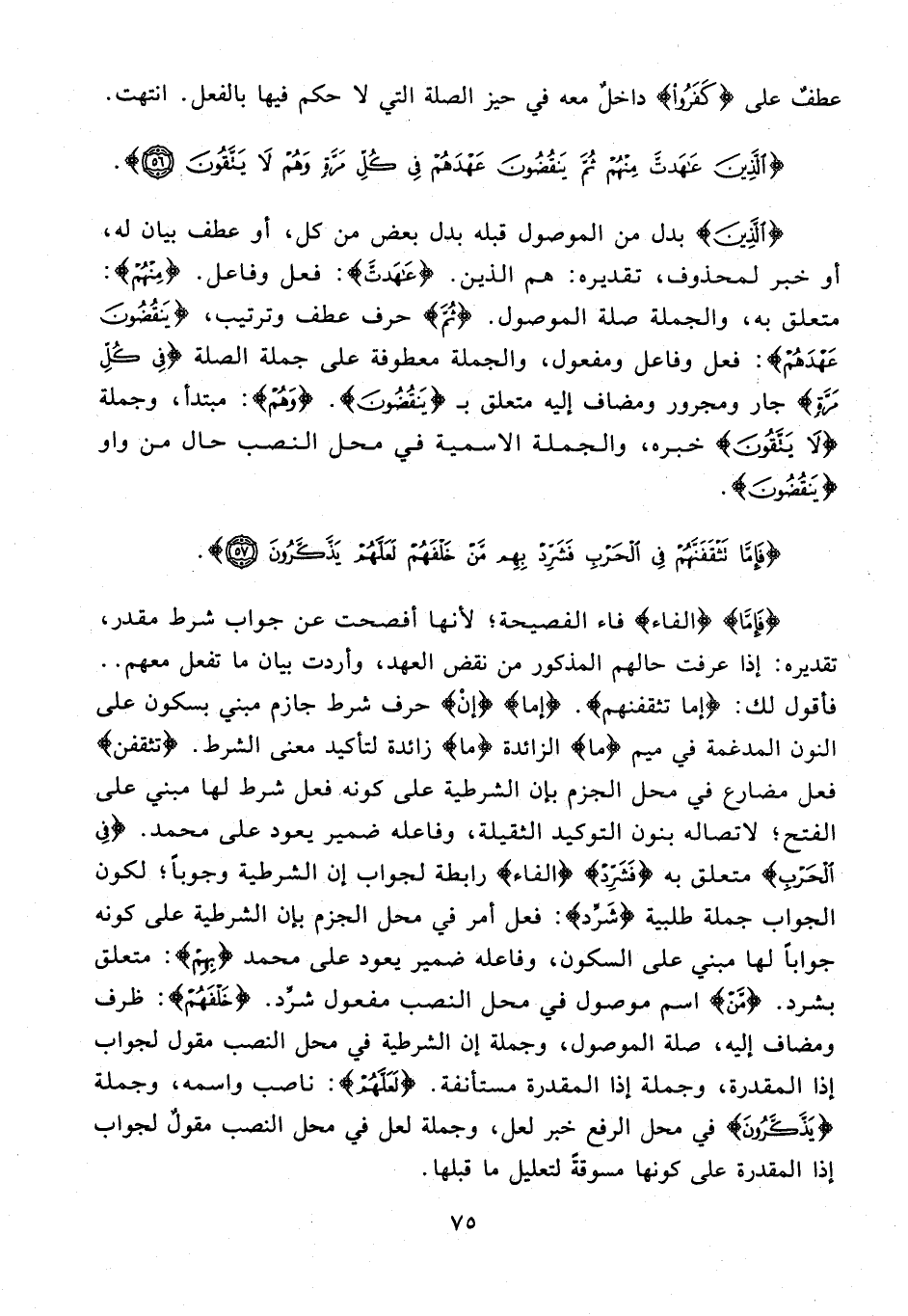 {فَإِمَّا} {الفاء} فاء الفصيحة؛ لأنها أفصحت عن جواب شرط مقدر، تقديره: إذا عرفت حالهم المذكور من نقض العهد، وأردت بيان ما تفعل معهم .. فأقول لك: {إما تثقفنهم}. {إما} {إنْ} حرف شرط جازم مبني بسكون على النون المدغمة في ميم {ما} الزائدة {ما} زائدة لتأكيد معنى الشرط. {تثقفن} فعل مضارع في محل الجزم بإن الشرطية على كونه فعل شرط لها مبني على الفتح؛ لاتصاله بنون التوكيد الثقيلة، وفاعله ضمير يعود على محمَّد. {فِي الْحَرْبِ} متعلق به {فَشَرِّدْ} {الفاء} رابطة لجواب إن الشرطية وجوبًا؛ لكون الجواب جملة طلبية {شَرِّدْ}: فعل أمر في محل الجزم بإن الشرطية على كونه جوابًا لها مبني على السكون، وفاعله ضمير يعود على محمَّد {بِهِمْ}: متعلق بشرد. {مَنْ} اسم موصول في محل النصب مفعول شرِّد. {خَلْفَهُمْ}: ظرف ومضاف إليه، صلة الموصول، وجملة إن الشرطية في محل النصب مقول لجواب إذا المقدرة، وجملة إذا المقدرة مستأنفة. {لَعَلَّهُمْ}: ناصب واسمه، وجملة {يَذَّكَّرُونَ} في محل الرفع خبر لعل، وجملة لعل في محل النصب مقولٌ لجواب إذا المقدرة على كونها مسوقةً لتعليل ما قبلها.