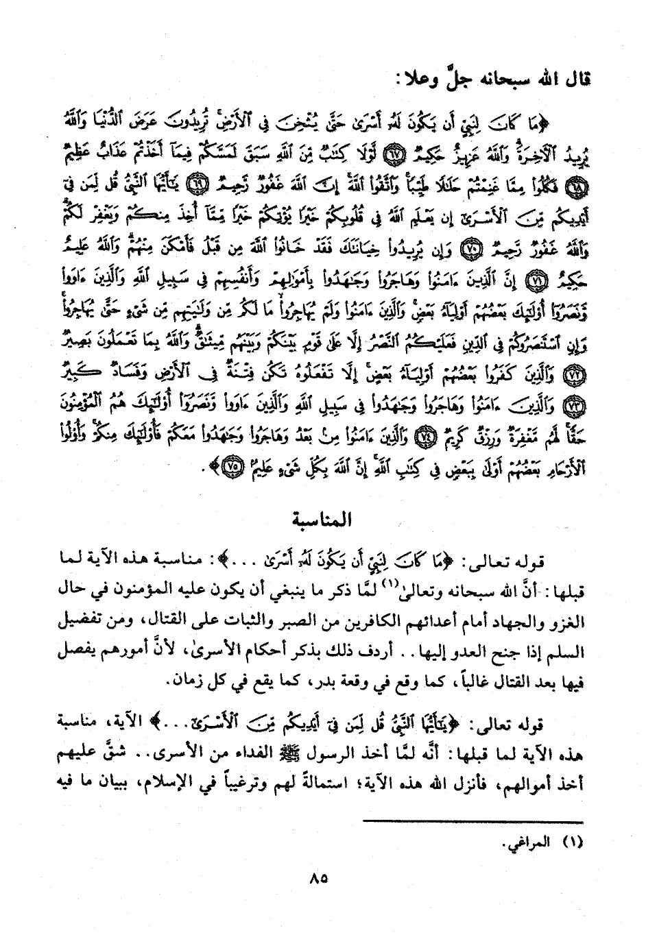 {مَا كَانَ لِنَبِيٍّ أَنْ يَكُونَ لَهُ أَسْرَى حَتَّى يُثْخِنَ فِي الْأَرْضِ تُرِيدُونَ عَرَضَ الدُّنْيَا وَاللَّهُ يُرِيدُ الْآخِرَةَ وَاللَّهُ عَزِيزٌ حَكِيمٌ (67) لَوْلَا كِتَابٌ مِنَ اللَّهِ سَبَقَ لَمَسَّكُمْ فِيمَا أَخَذْتُمْ عَذَابٌ عَظِيمٌ (68) فَكُلُوا مِمَّا غَنِمْتُمْ حَلَالًا طَيِّبًا وَاتَّقُوا اللَّهَ إِنَّ اللَّهَ غَفُورٌ رَحِيمٌ (69) يَا أَيُّهَا النَّبِيُّ قُلْ لِمَنْ فِي أَيْدِيكُمْ مِنَ الْأَسْرَى إِنْ يَعْلَمِ اللَّهُ فِي قُلُوبِكُمْ خَيْرًا يُؤْتِكُمْ خَيْرًا مِمَّا أُخِذَ مِنْكُمْ وَيَغْفِرْ لَكُمْ وَاللَّهُ غَفُورٌ رَحِيمٌ (70) وَإِنْ يُرِيدُوا خِيَانَتَكَ فَقَدْ خَانُوا اللَّهَ مِنْ قَبْلُ فَأَمْكَنَ مِنْهُمْ وَاللَّهُ عَلِيمٌ حَكِيمٌ (71) إِنَّ الَّذِينَ آمَنُوا وَهَاجَرُوا وَجَاهَدُوا بِأَمْوَالِهِمْ وَأَنْفُسِهِمْ فِي سَبِيلِ اللَّهِ وَالَّذِينَ آوَوْا وَنَصَرُوا أُولَئِكَ بَعْضُهُمْ أَوْلِيَاءُ بَعْضٍ وَالَّذِينَ آمَنُوا وَلَمْ يُهَاجِرُوا مَا لَكُمْ مِنْ وَلَايَتِهِمْ مِنْ شَيْءٍ حَتَّى يُهَاجِرُوا وَإِنِ اسْتَنْصَرُوكُمْ فِي الدِّينِ فَعَلَيْكُمُ النَّصْرُ إِلَّا عَلَى قَوْمٍ بَيْنَكُمْ وَبَيْنَهُمْ مِيثَاقٌ وَاللَّهُ بِمَا تَعْمَلُونَ بَصِيرٌ (72) وَالَّذِينَ كَفَرُوا بَعْضُهُمْ أَوْلِيَاءُ بَعْضٍ إِلَّا تَفْعَلُوهُ تَكُنْ فِتْنَةٌ فِي الْأَرْضِ وَفَسَادٌ كَبِيرٌ (73) وَالَّذِينَ آمَنُوا وَهَاجَرُوا وَجَاهَدُوا فِي سَبِيلِ اللَّهِ وَالَّذِينَ آوَوْا وَنَصَرُوا أُولَئِكَ هُمُ الْمُؤْمِنُونَ حَقًّا لَهُمْ مَغْفِرَةٌ وَرِزْقٌ كَرِيمٌ (74) وَالَّذِينَ آمَنُوا مِنْ بَعْدُ وَهَاجَرُوا وَجَاهَدُوا مَعَكُمْ فَأُولَئِكَ مِنْكُمْ وَأُولُو الْأَرْحَامِ بَعْضُهُمْ أَوْلَى بِبَعْضٍ فِي كِتَابِ اللَّهِ إِنَّ اللَّهَ بِكُلِّ شَيْءٍ عَلِيمٌ (75)}.