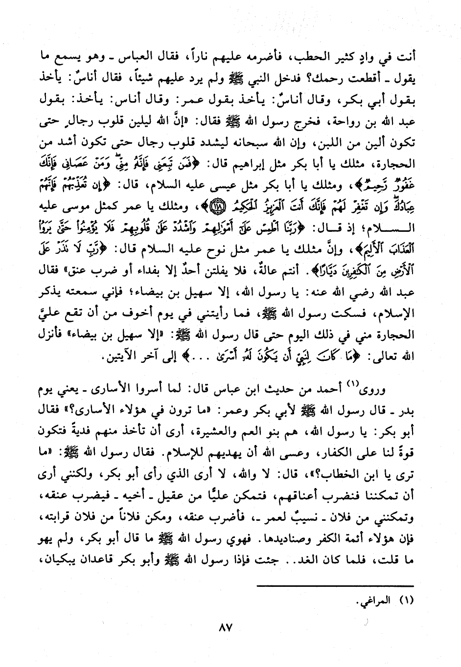 أنت في وادٍ كثير الحطب، فأضرمه عليهم نارًا، فقال العباس - وهو يسمع ما يقول - أقطعت رحمك؟ فدخل النبي - صلى الله عليه وسلم - ولم يرد عليهم شيئًا، فقال أناسٌ: يأخذ بقول أبي بكر، وقال أناسٌ: يأخذ بقول عمر: وقال أناس: يأخذ: بقول عبد الله بن رواحة، فخرج رسول الله - صلى الله عليه وسلم - فقال: "إنَّ الله ليلين قلوب رجالٍ حتى تكون ألين من اللبن، وإن الله سبحانه ليشدد قلوب رجال حتى تكون أشد من الحجارة، مثلك يا أبا بكر مثل إبراهيم قال: {فَمَنْ تَبِعَنِي فَإِنَّهُ مِنِّي وَمَنْ عَصَانِي فَإِنَّكَ غَفُورٌ رَحِيمٌ}، ومثلك يا أبا بكر مثل عيسى عليه السلام، قال: {إِنْ تُعَذِّبْهُمْ فَإِنَّهُمْ عِبَادُكَ وَإِنْ تَغْفِرْ لَهُمْ فَإِنَّكَ أَنْتَ الْعَزِيزُ الْحَكِيمُ (118)}، ومثلك يا عمر كمثل موسى عليه السلام؛ إذ قال: {رَبَّنَا اطْمِسْ عَلَى أَمْوَالِهِمْ وَاشْدُدْ عَلَى قُلُوبِهِمْ فَلَا يُؤْمِنُوا حَتَّى يَرَوُا الْعَذَابَ الْأَلِيمَ}، وإنَّ مثلك يا عمر مثل نوح عليه السلام قال: {رَبِّ لَا تَذَرْ عَلَى الْأَرْضِ مِنَ الْكَافِرِينَ دَيَّارًا}. أنتم عالةٌ، فلا يفلتن أحدٌ إلا بفداء أو ضرب عنق" فقال عبد الله رضي الله عنه: يا رسول الله، إلا سهيل بن بيضاء؛ فإني سمعته يذكر الإِسلام، فسكت رسول الله - صلى الله عليه وسلم -، فما رأيتني في يوم أخوف من أن تقع عليَّ الحجارة منى في ذلك اليوم حتى قال رسول الله - صلى الله عليه وسلم -: "إلا سهيل بن بيضاء" فأنزل الله تعالى: {مَا كَانَ لِنَبِيٍّ أَنْ يَكُونَ لَهُ أَسْرَى ...} إلى آخر الآيتين.