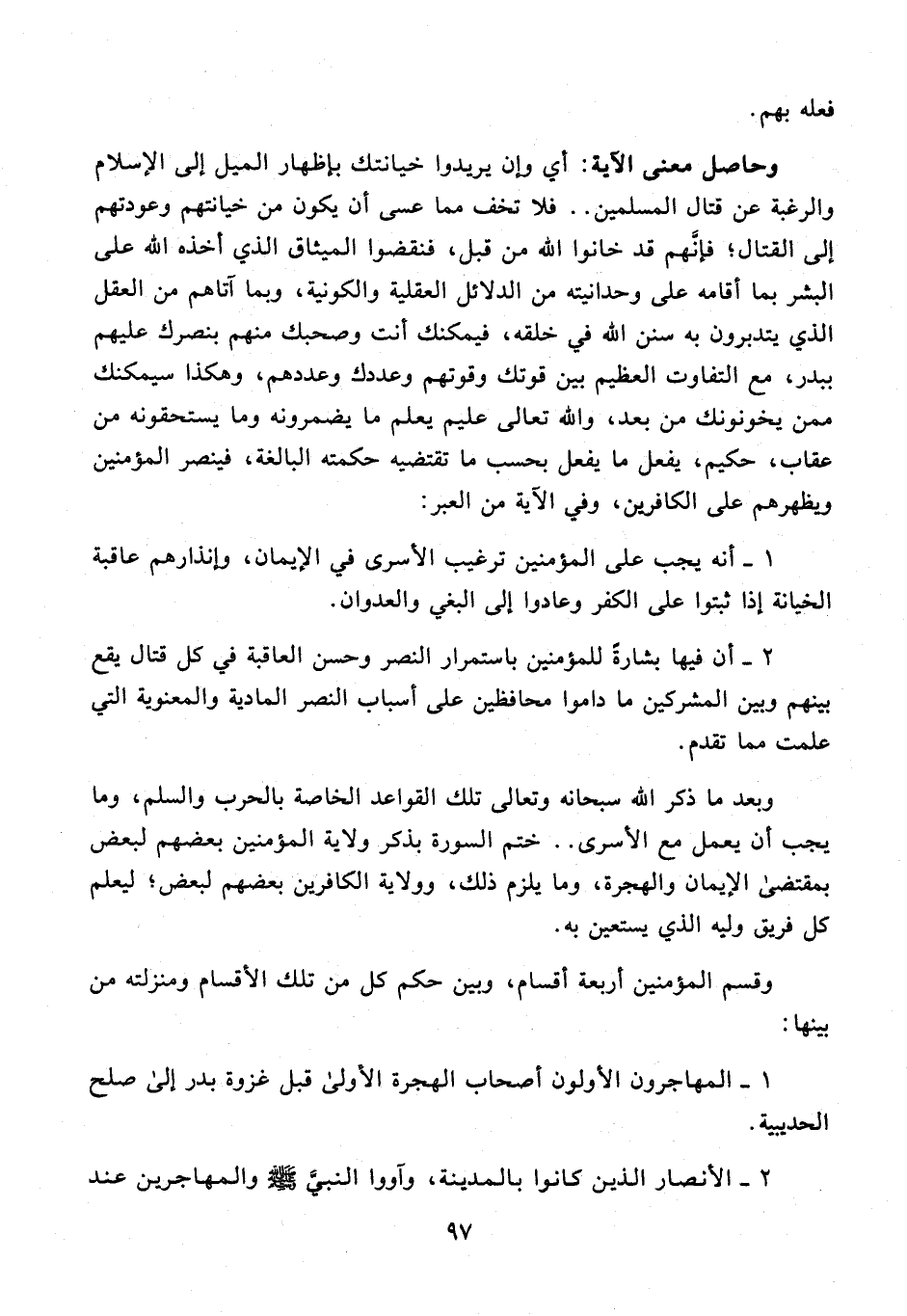 وبعد ما ذكر الله سبحانه وتعالى تلك القواعد الخاصة بالحرب والسلم، وما يجب أن يعمل مع الأسرى .. ختم السورة بذكر ولاية المؤمنين بعضهم لبعض بمقتضى الإيمان والهجرة، وما يلزم ذلك، وولاية الكافرين بعضهم لبعض؛ ليعلم كل فريق وليه الذي يستعين به.