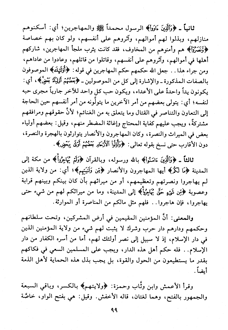 ثالثًا - {وَالَّذِينَ آمَنُوا} بالله ورسوله، وبالقرآن {وَلَمْ يُهَاجِرُوا} من مكة إلى المدينة {مَا لَكُمْ} أيها المهاجرون والأنصار {مِنْ وَلَايَتِهِمْ}؛ أي: من ولاية الذين لم يهاجروا ونصرتهم وتعظيمهم، أو من ميراثهم بأن كان بينكم وبينهم قرابة وعصوبة {مِنْ شَيْءٍ حَتَّى يُهَاجِرُوا} إلى المدينة، وما من ميراثكم لهم من شيء حتى يهاجروا، فإن هاجروا .. فلهم مثل ما لكم من المناصرة أو الموارثة.