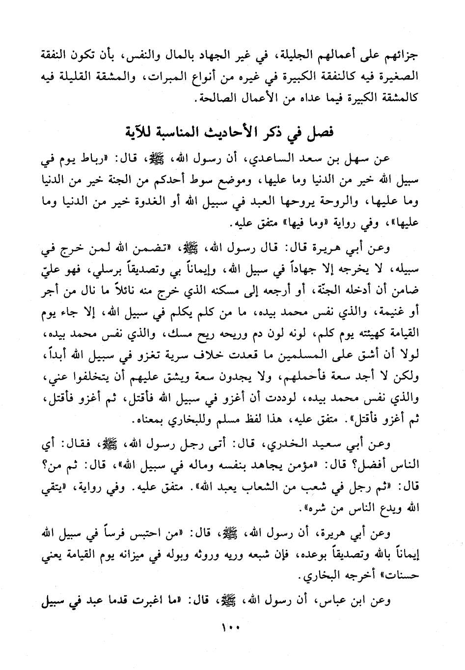 وعن أبي هريرة قال: قال رسول الله، - صلى الله عليه وسلم -، "تضمن الله لمن خرج في سبيله، لا يخرجه إلا جهادًا في سبيل الله، وإيمانًا بي وتصديقًا برسلي، فهو عليّ ضامن أن أدخله الجنّة، أو أرجعه إلى مسكنه الذي خرج منه نائلًا ما نال من أجر أو غنيمة، والذي نفس محمَّد بيده، ما من كلم يكلم في سبيل الله، إلا جاء يوم القيامة كهيئته يوم كلم، لونه لون دم وريحه ريح مسك، والذي نفس محمَّد بيده، لولا أن أشق على المسلمين ما قعدت خلاف سرية تغزو في سبيل الله أبدًا، ولكن لا أجد سعة فأحملهم، ولا يجدون سعة ويشق عليهم أن يتخلفوا عني، والذي نفس محمَّد بيده، لوددت أن أغزو في سبيل الله فأقتل، ثم أغزو فأقتل، ثم أغزو فأقتل". متفق عليه، هذا لفظ مسلم وللبخاري بمعناه.