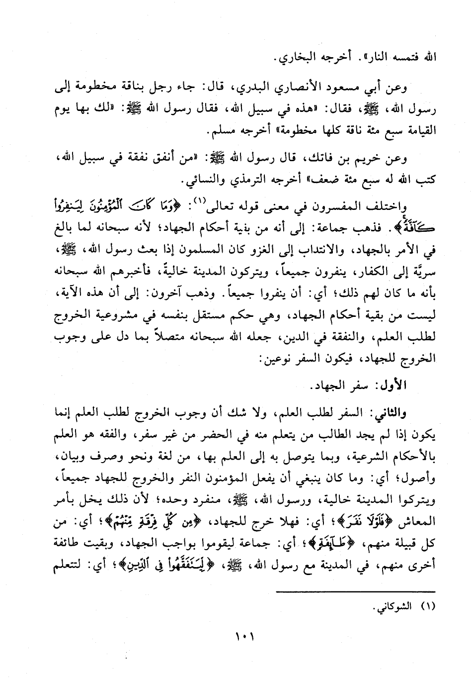 122 - واختلف المفسرون في معنى قوله تعالى (¬1): {وَمَا كَانَ الْمُؤْمِنُونَ لِيَنْفِرُوا كَافَّةً}. فذهب جماعة: إلى أنه من بقية أحكام الجهاد؛ لأنه سبحانه لما بالغ في الأمر بالجهاد، والانتداب إلى الغزو كان المسلمون إذا بعث رسول الله، - صلى الله عليه وسلم -، سرية إلى الكفار، ينفرون جميعًا، ويتركون المدينة خاليةً، فأخبرهم الله سبحانه بأنه ما كان لهم ذلك؛ أي: أن ينفروا جميعًا. وذهب آخرون: إلى أن هذه الآية، ليست من بقية أحكام الجهاد، وهي حكم مستقل بنفسه في مشروعية الخروج لطلب العلم، والنفقة في الدين، جعله الله سبحانه متصلًا بما دل على وجوب الخروج للجهاد، فيكون السفر نوعين: