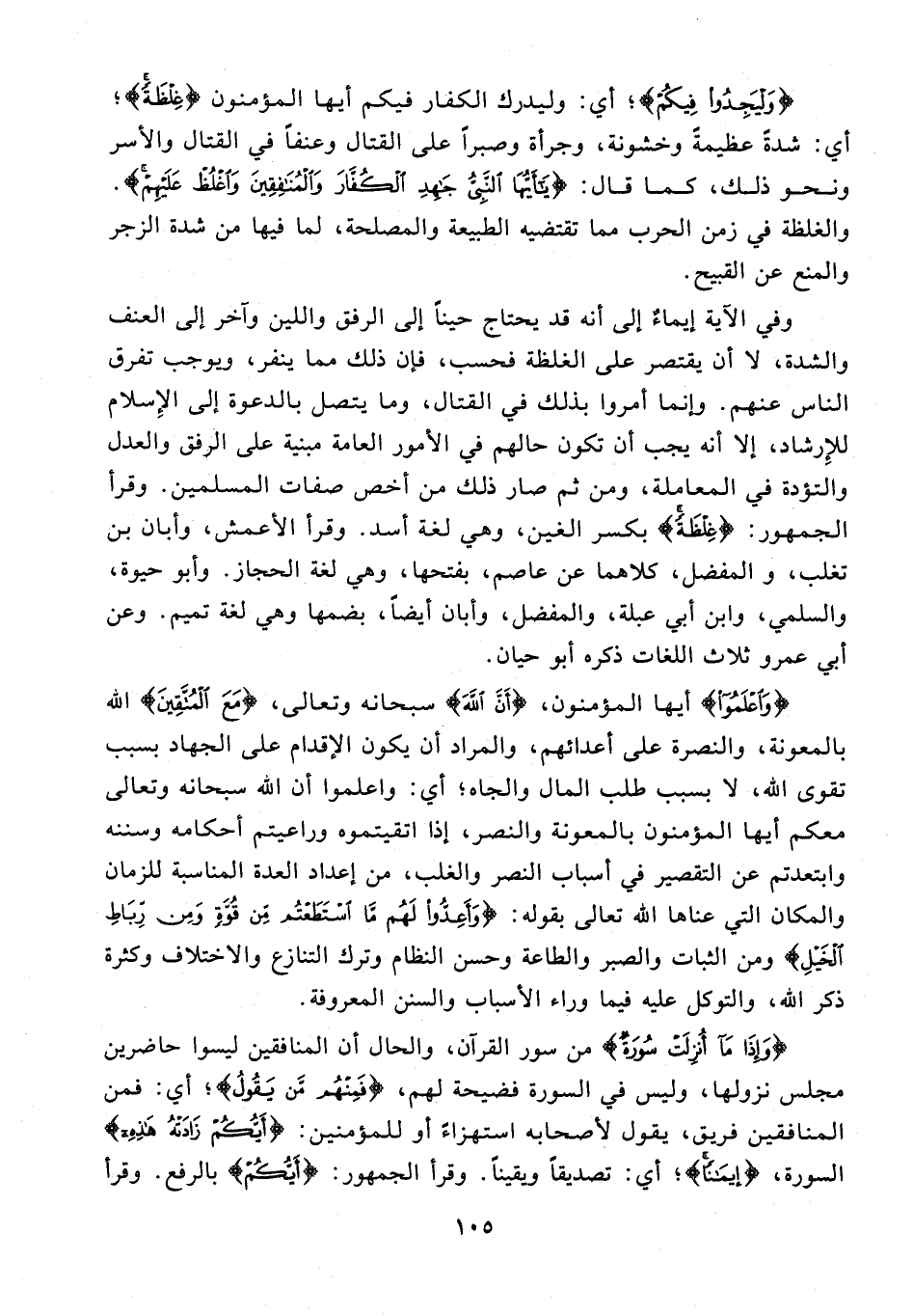 وفي الآية إيماءٌ إلى أنه قد يحتاج حينًا إلى الرفق واللين وآخر إلى العنف والشدة، لا أن يقتصر على الغلظة فحسب، فإن ذلك مما ينفر، ويوجب تفرق الناس عنهم. وإنما أمروا بذلك في القتال، وما يتصل بالدعوة إلى الإِسلام للإِرشاد، إلا أنه يجب أن تكون حالهم في الأمور العامة مبنية على الرفق والعدل والتؤدة في المعاملة، ومن ثم صار ذلك من أخص صفات المسلمين. وقرأ الجمهور: {غِلْظَةً} بكسر الغين، وهي لغة أسد. وقرأ الأعمش، وأبان بن تغلب، والمفضل، كلاهما عن عاصم، بفتحها، وهي لغة الحجاز. وأبو حيوة، والسلمي، وابن أبي عبلة، والمفضل، وأبان أيضًا، بضمها وهي لغة تميم. وعن أبي عمرو ثلاث اللغات ذكره أبو حيان.