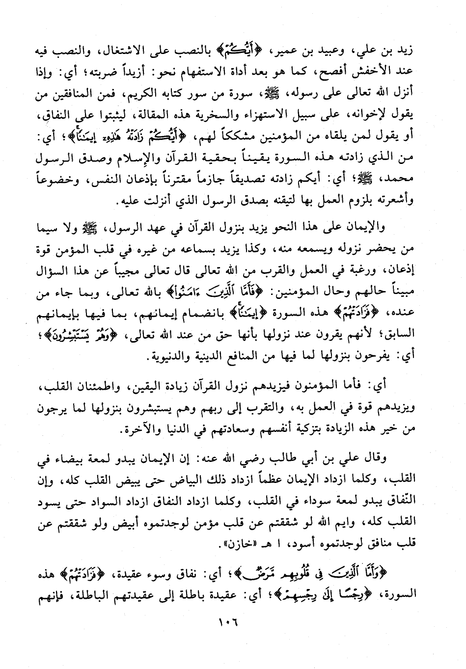 والإيمان على هذا النحو يزيد بنزول القرآن في عهد الرسول، - صلى الله عليه وسلم - ولا سيما من يحضر نزوله ويسمعه منه، وكذا يزيد بسماعه من غيره في قلب المؤمن قوة إذعان، ورغبة في العمل والقرب من الله تعالى قال تعالى مجيبًا عن هذا السؤال مبينًا حالهم وحال المؤمنين: {فَأَمَّا الَّذِينَ آمَنُوا} بالله تعالى، وبما جاء من عنده، {فَزَادَتْهُمْ} هذه السورة {إِيمَانًا} بانضمام إيمانهم، بما فيها بإيمانهم السابق؛ لأنهم يقرون عند نزولها بأنها حق من عند الله تعالى، {وَهُمْ يَسْتَبْشِرُونَ}؛ أي: يفرحون بنزولها لما فيها من المنافع الدينية والدنيوية.