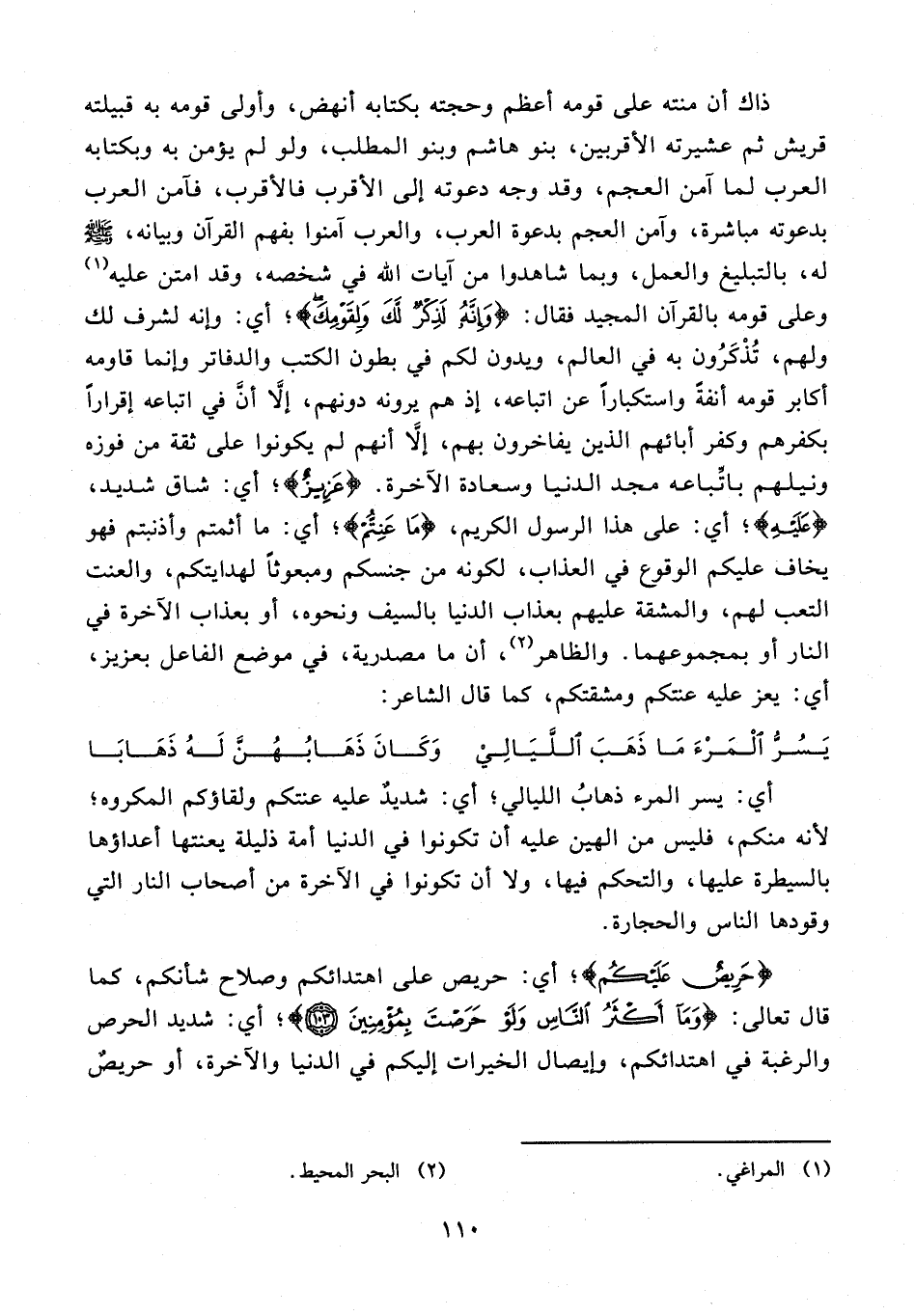 ذاك أن منته على قومه أعظم وحجته بكتابه أنهض، وأولى قومه به قبيلته قريش ثم عشيرته الأقربين، بنو هاشم وبنو المطلب، ولو لم يؤمن به وبكتابه العرب لما آمن العجم، وقد وجه دعوة إلى الأقرب فالأقرب، فآمن العرب بدعوته مباشرة، وآمن العجم بدعوة العرب، والعرب آمنوا بفهم القرآن وبيانه، - صلى الله عليه وسلم - له، بالتبليغ والعمل، وبما شاهدوا من آيات الله في شخصه، وقد امتن عليه (¬1) وعلى قومه بالقرآن المجيد فقال: {وَإِنَّهُ لَذِكْرٌ لَكَ وَلِقَوْمِكَ}؛ أي: وإنه لشرف لك ولهم، تُذْكَرُون به في العالم، ويدون لكم في بطون الكتب والدفاتر وإنما قاومه أكابر قومه أنفةً واستكبارًا عن اتباعه، إذ هم يرونه دونهم، إلَّا أنَّ في اتباعه إقرارًا بكفرهم وكفر أبائهم الذين يفاخرون بهم، إلا أنهم لم يكونوا على ثقة من فوزه ونيلهم باتِّباعه مجد الدنيا وسعادة الآخرة. {عَزِيزٌ}؛ أي: شاق شديد، {عَلَيْهِ}؛ أي: على هذا الرسول الكريم، {مَا عَنِتُّمْ}؛ أي: ما أثمتم وأذنبتم فهو يخاف عليكم الوقوع في العذاب، لكونه من جنسكم ومبعوثًا لهدايتكم، والعنت التعب لهم، والمشقة عليهم بعذاب الدنيا بالسيف ونحوه، أو بعذاب الآخرة في النار أو بمجموعهما. والظاهر (¬2)، أن ما مصدرية، في موضع الفاعل بعزيز، أي: يعز عليه عنتكم ومشقتكم، كما قال الشاعر: