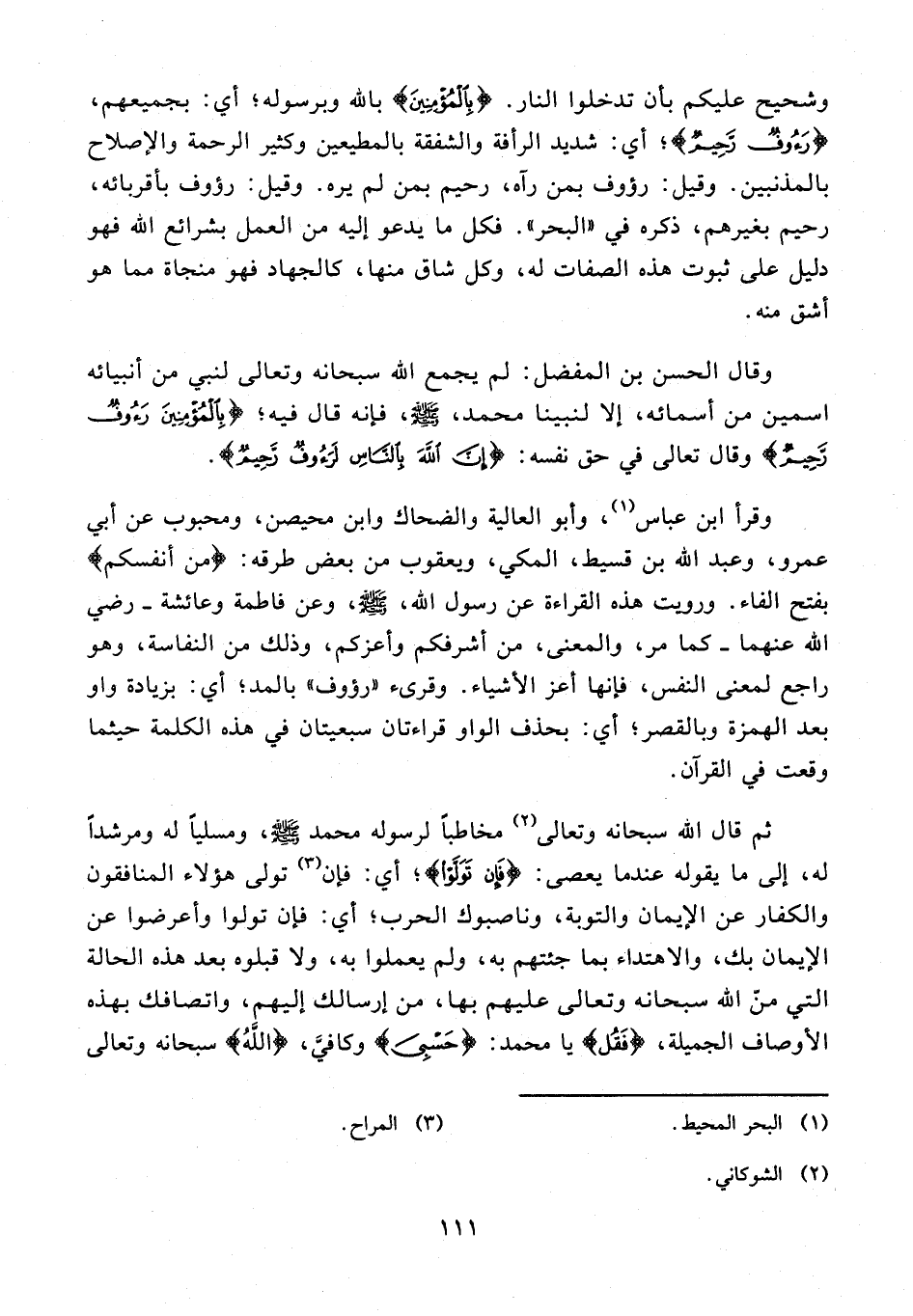 وقرأ ابن عباس (¬1)، وأبو العالية والضحاك وابن محيصن، ومحبوب عن أبي عمرو، وعبد الله بن قسيط، المكي، ويعقوب من بعض طرقه: {من أنفسكم} بفتح الفاء. ورويت هذه القراءة عن رسول الله، - صلى الله عليه وسلم -، وعن فاطمة وعائشة - رضي الله عنهما - كما مر، والمعنى، من أشرفكم وأعزكم، وذلك من النفاسة، وهو راجع لمعنى النفس، فإنها أعز الأشياء. وقرىء "رؤوف" بالمد؛ أي: بزيادة واو بعد الهمزة وبالقصر؛ أي: بحذف الواو قراءتان سبعيتان في هذه الكلمة حيثما وقعت في القرآن.