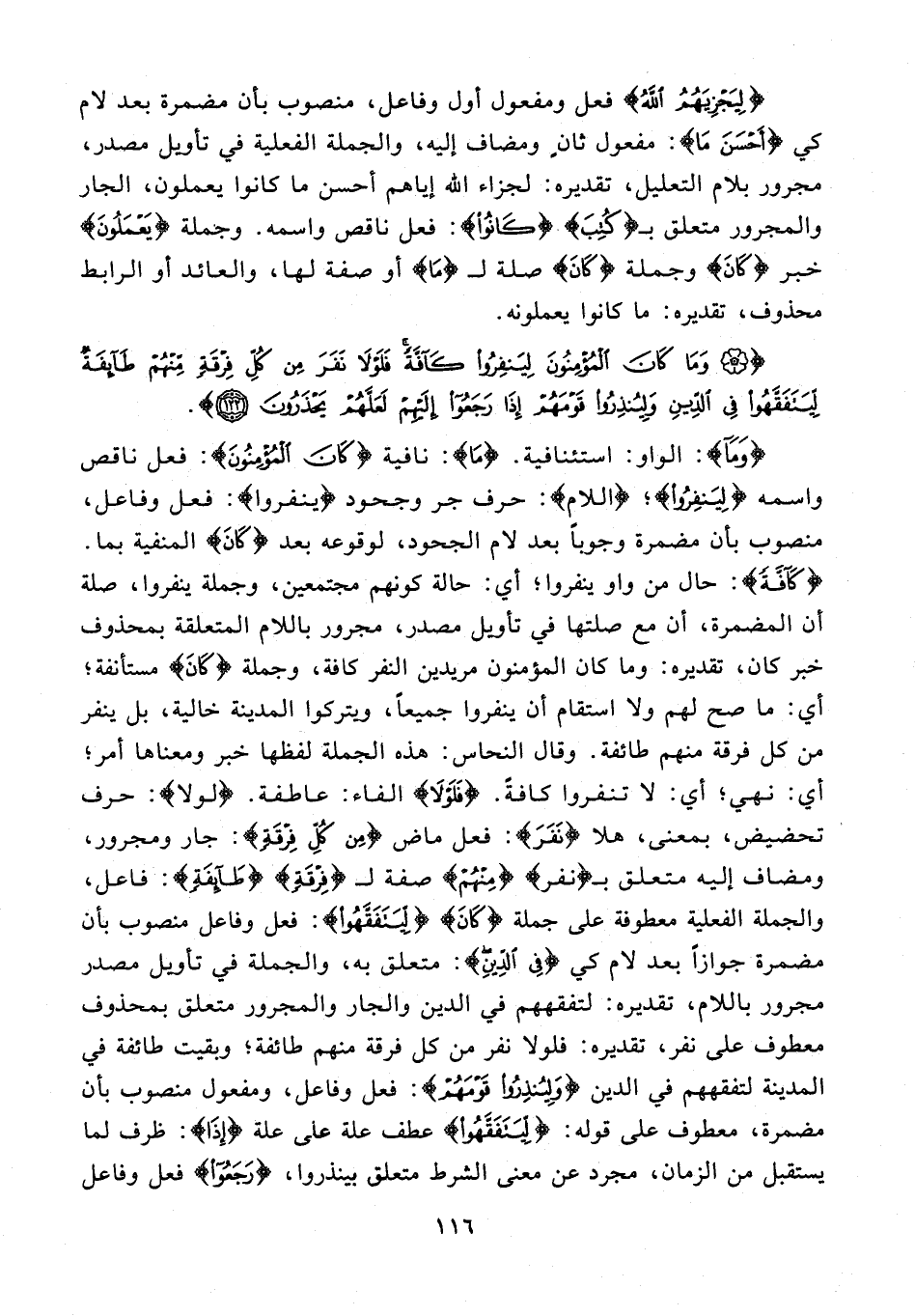 {وَمَا}: الواو: استئنافية. {مَا}: نافية {كَانَ الْمُؤْمِنُونَ}: فعل ناقص واسمه {لِيَنْفِرُوا}؛ {اللام}: حرف جر وجحود {ينفروا}: فعل وفاعل، منصوب بأن مضمرة وجوبًا بعد لام الجحود، لوقوعه بعد {كَانَ} المنفية بما. {كَافَّةً}: حال من واو ينفروا؛ أي: حالة كونهم مجتمعين، وجملة ينفروا، صلة أن المضمرة، أن مع صلتها في تأويل مصدر، مجرور باللام المتعلقة بمحذوف خبر كان، تقديره: وما كان المؤمنون مريدين النفر كافة، وجملة {كَانَ} مستأنفة؛ أي: ما صح لهم ولا استقام أن ينفروا جميعًا، ويتركوا المدينة خالية، بل ينفر من كل فرقة منهم طائفة. وقال النحاس: هذه الجملة لفظها خبر ومعناها أمر؛ أي: نهي؛ أي: لا تنفروا كافةً. {فَلَوْلَا} الفاء: عاطفة. {لولا}: حرف تحضيض، بمعنى، هلا {نَفَرَ}: فعل ماض {مِنْ كُلِّ فِرْقَةٍ}: جار ومجرور، ومضاف إليه متعلق بـ {نفر} {مِنْهُمْ} صفة لـ {فِرْقَةٍ} {طَائِفَةٍ}: فاعل، والجملة الفعلية معطوفة على جملة {كَانَ} {لِيَتَفَقَّهُوا}: فعل وفاعل منصوب بأن مضمرة جوازًا بعد لام كي {فِي الدِّينِ}: متعلق به، والجملة في تأويل مصدر مجرور باللام، تقديره: لتفقههم في الدين والجار والمجرور متعلق بمحذوف معطوف على نفر، تقديره: فلولا نفر من كل فرقة منهم طائفة؛ وبقيت طائفة في المدينة لتفقههم في الدين {وَلِيُنْذِرُوا قَوْمَهُمْ}: فعل وفاعل، ومفعول منصوب بأن مضمرة، معطوف على قوله: {لِيَتَفَقَّهُوا} عطف علة على علة {إِذَا}: ظرف لما يستقبل من الزمان، مجرد عن معنى الشرط متعلق بينذروا، {رَجَعُوا} فعل وفاعل