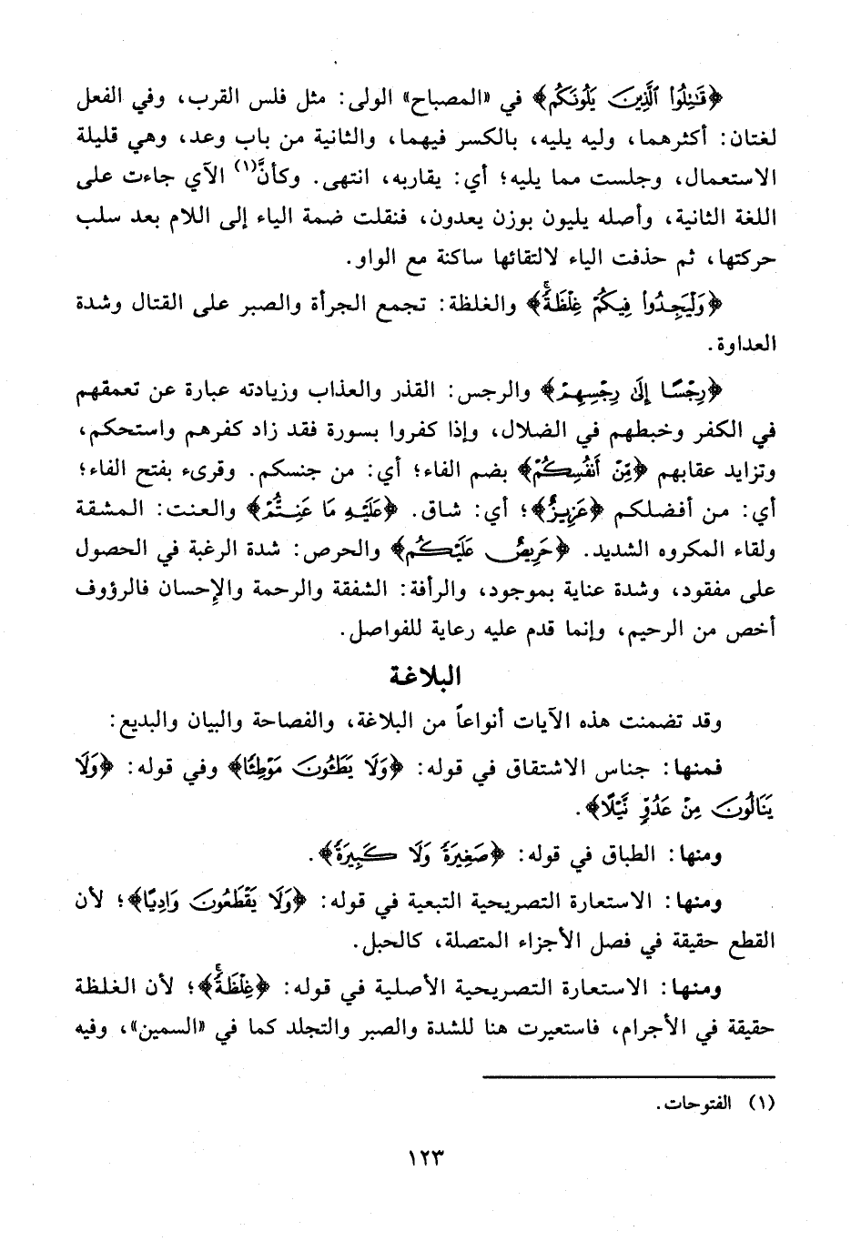 {قَاتِلُوا الَّذِينَ يَلُونَكُمْ} في "المصباح" الولى: مثل فلس القرب، وفي الفعل لغتان: أكثرهما، وليه يليه، بالكسر فيهما، والثانية من باب وعد، وهي قليلة الاستعمال، وجلست مما يليه؛ أي: يقاربه، انتهى. وكأنَّ (¬1) الآي جاءت على اللغة الثانية، وأصله يليون بوزن يعدون، فنقلت ضمة الياء إلى اللام بعد سلب حركتها، ثم حذفت الياء لالتقائها ساكنة مع الواو.