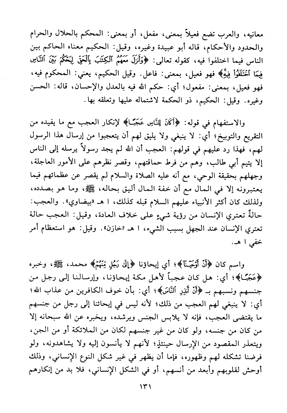 2 - والاستفهام في قوله: {أَكَانَ لِلنَّاسِ عَجَبًا} لإنكار العجب مع ما يفيده من التقريع والتوبيخ؛ أي: لا ينبغي ولا يليق لهم أن يتعجبوا من إرسال هذا الرسول لهم، فهذا رد عليهم في قولهم: العجب أن الله لم يجد رسولًا يرسله إلى الناس إلا يتيم أبي طالب، وهم من فرط حماقتهم، وقصر نظرهم على الأمور العاجلة، وجهلهم بحقيقة الوحي، مع أنه عليه الصلاة والسلام لم يقصر عن عظمائهم فيما يعتبرونه إلا في المال مع أن خفة المال أليق بحاله، - صلى الله عليه وسلم -، وما هو بصدده، ولذلك كان أكثر الأنبياء عليهم السلام قبله كذلك، اهـ "بيضاوي". والعجب: حالةٌ تعتري الإنسان من رؤية شيءٍ على خلاف العادة، وقيل: العجب حالة تعتري الإنسان عند الجهل بسبب الشيء، اهـ "خازن". وقيل: هو استعظام أمر خفي اهـ.