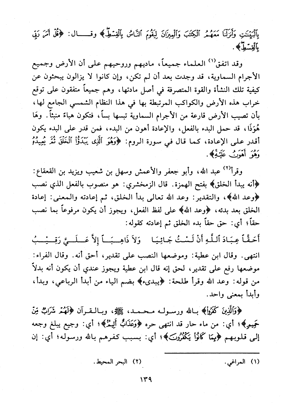 وقد اتفق (¬1) العلماء جميعًا، ماديهم وروحيهم على أن الأرض وجميع الأجرام السماوية، قد وجدت بعد أن لم تكن، وإن كانوا لا يزالون يبحثون عن كيفية تلك النشأة والقوة المتصرفة في أصل مادتها، وهم جميعًا متفقون على توقع خراب هذه الأرض والكواكب المرتبطة بها في هذا النظام الشمسي الجامع لها، بأن تصيب الأرض قارعة من الأجرام السماوية تبسها بسًّا، فتكون هباءً منبثًا. وهَا هُوَذَا، قد حمل البدء بالفعل، والإعادة أهون من البدء، فمن قدر على البدء يكون أقدر على الإعادة، كما قال في سورة الروم: {وَهُوَ الَّذِي يَبْدَأُ الْخَلْقَ ثُمَّ يُعِيدُهُ وَهُوَ أَهْوَنُ عَلَيْهِ}.