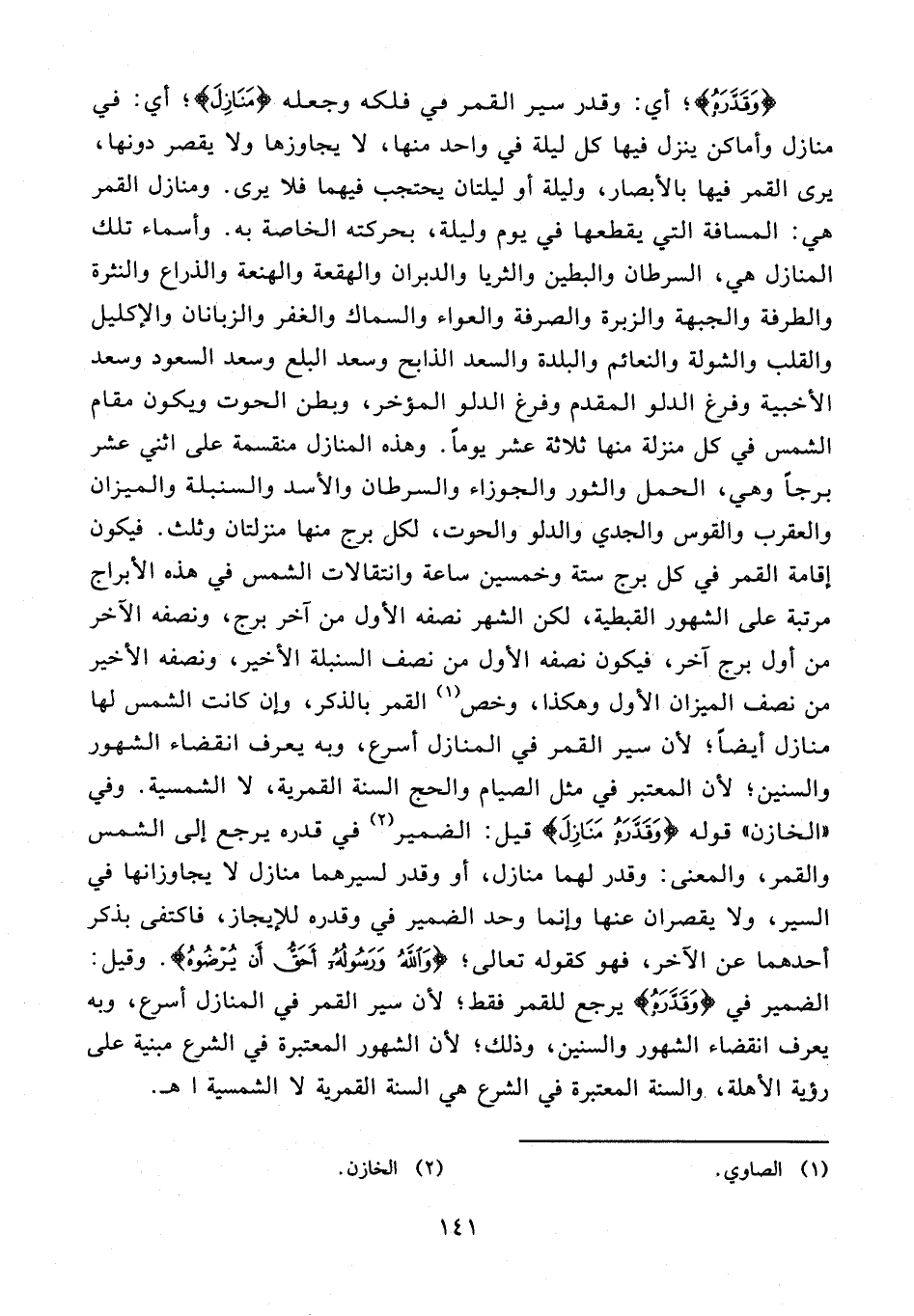 {وَقَدَّرَهُ}؛ أي: وقدر سير القمر في فلكه وجعله {مَنَازِلَ}؛ أي: في منازل وأماكن ينزل فيها كل ليلة في واحد منها، لا يجاوزها ولا يقصر دونها، يرى القمر فيها بالأبصار، وليلة أو ليلتان يحتجب فيهما فلا يرى. ومنازل القمر هي: المسافة التي يقطعها في يوم وليلة، بحركته الخاصة به. وأسماء تلك المنازل هي، السرطان والبطين والثريا والدبران والهقعة والهنعة والذراع والنثرة والطرفة والجبهة والزبرة والصرفة والعواء والسماك والغفر والزبانان والإكليل والقلب والشولة والنعائم والبلدة والسعد الذابح وسعد البلع وسعد السعود وسعد الأخبية وفرغ الدلو المقدم وفرغ الدلو المؤخر، وبطن الحوت ويكون مقام الشمس في كل منزلة منها ثلاثة عشر يومًا. وهذه المنازل منقسمة على اثني عشر برجًا وهي، الحمل والثور والجوزاء والسرطان والأسد والسنبلة والميزان والعقرب والقوس والجدي والدلو والحوت، لكل برج منها منزلتان وثلث. فيكون إقامة القمر في كل برج ستة وخمسين ساعة وانتقالات الشمس في هذه الأبراج مرتبة على الشهور القبطية، لكن الشهر نصفه الأول من آخر برج، ونصفه الآخر من أول برج آخر، فيكون نصفه الأول من نصف السنبلة الأخير، ونصفه الأخير من نصف الميزان الأول وهكذا، وخص (¬1) القمر بالذكر، وإن كانت الشمس لها منازل أيضًا؛ لأن سير القمر في المنازل أسرع، وبه يعرف انقضاء الشهور والسنين؛ لأن المعتبر في مثل الصيام والحج السنة القمرية، لا الشمسية. وفي "الخازن" قوله {وَقَدَّرَهُ مَنَازِلَ} قيل: الضمير (¬2) في قدره يرجع إلى الشمس والقمر، والمعنى: وقدر لهما منازل، أو وقدر لسيرهما منازل لا يجاوزانها في السير، ولا يقصران عنها وإنما وحد الضمير في وقدره للإيجاز، فاكتفى بذكر أحدهما عن الآخر، فهو كقوله تعالى؛ {وَاللَّهُ وَرَسُولُهُ أَحَقُّ أَنْ يُرْضُوهُ} وقيل: الضمير في {وَقَدَّرَهُ} يرجع للقمر فقط؛ لأن سير القمر في المنازل أسرع، وبه يعرف انقضاء الشهور والسنين، وذلك؛ لأن الشهور المعتبرة في الشرع مبنية على رؤية الأهلة، والسنة المعتبرة في الشرع هي السنة القمرية لا الشمسية اهـ.