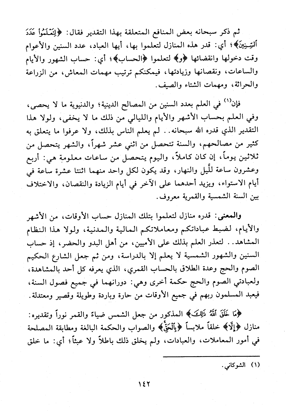 والمعنى: قدره منازل لتعلموا بتلك المنازل حساب الأوقات، من الأشهر والأيام، لضبط عباداتكم ومعاملاتكم المالية والمدنية، ولولا هذا النظام المشاهد .. لتعذر العلم بذلك على الأميين، من أهل البدو والحضر، إذ حساب السنين والشهور الشمسية لا يعلم إلا بالدراسة، ومن ثم جعل الشارع الحكيم الصوم والحج وعدة الطلاق بالحساب القمري، الذي يعرفه كل أحد بالمشاهدة، ولعبادتي الصوم والحج حكمة أخرى وهي: دورانهما في جميع فصول السنة، فيعبد المسلمون ربهم في جميع الأوقات من حارة وباردة وطويلة وقصير ومعتدلة.