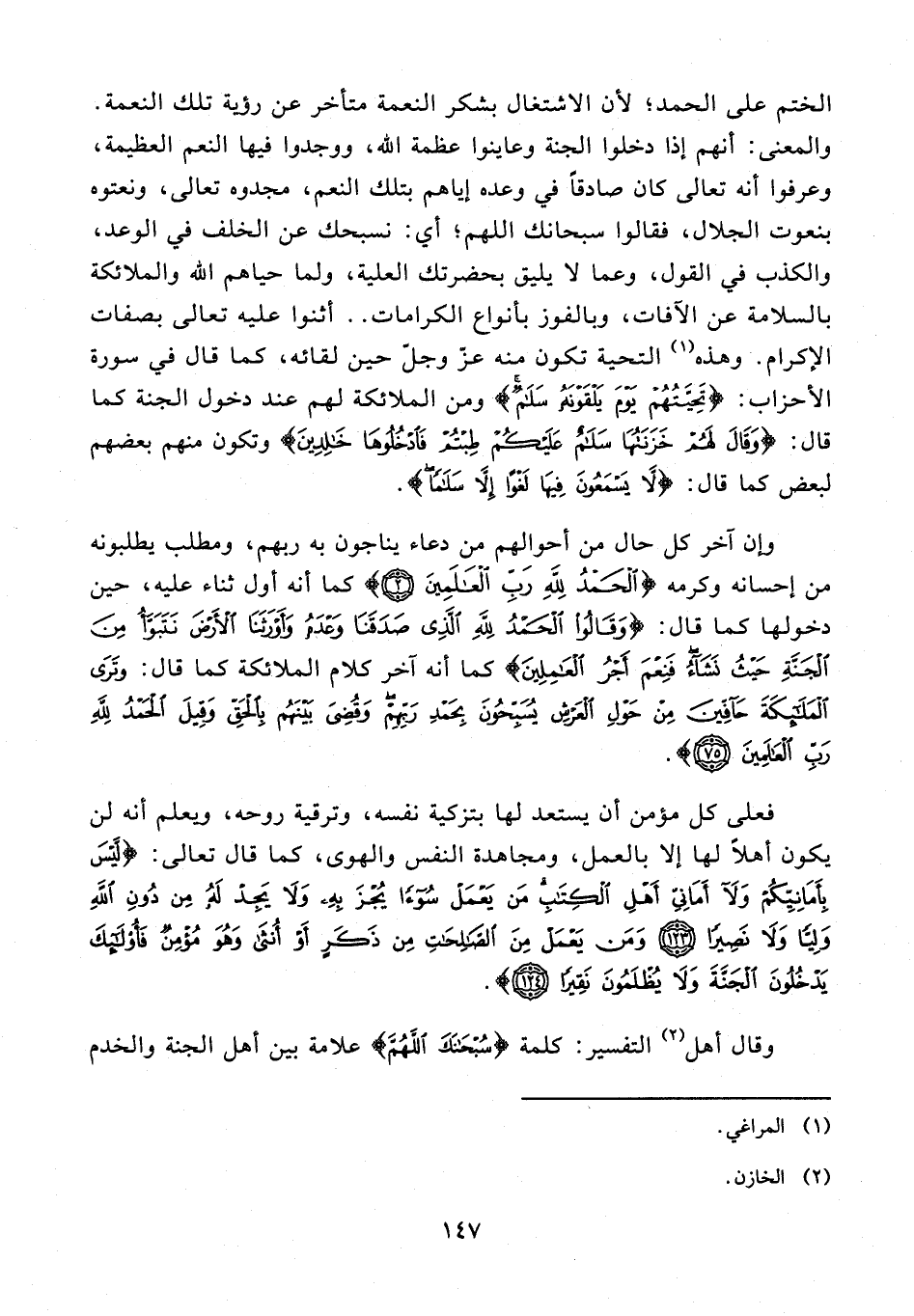 وإن آخر كل حال من أحوالهم من دعاء يناجون به ربهم، ومطلب يطلبونه من إحسانه وكرمه {الْحَمْدُ لِلَّهِ رَبِّ الْعَالَمِينَ} كما أنه أول ثناء عليه، حين دخولها كما قال: {وَقَالُوا الْحَمْدُ لِلَّهِ الَّذِي صَدَقَنَا وَعْدَهُ وَأَوْرَثَنَا الْأَرْضَ نَتَبَوَّأُ مِنَ الْجَنَّةِ حَيْثُ نَشَاءُ فَنِعْمَ أَجْرُ الْعَامِلِينَ} كما أنه آخر كلام الملائكة كما قال: {وَتَرَى الْمَلَائِكَةَ حَافِّينَ مِنْ حَوْلِ الْعَرْشِ يُسَبِّحُونَ بِحَمْدِ رَبِّهِمْ وَقُضِيَ بَيْنَهُمْ بِالْحَقِّ وَقِيلَ الْحَمْدُ لِلَّهِ رَبِّ الْعَالَمِينَ}.