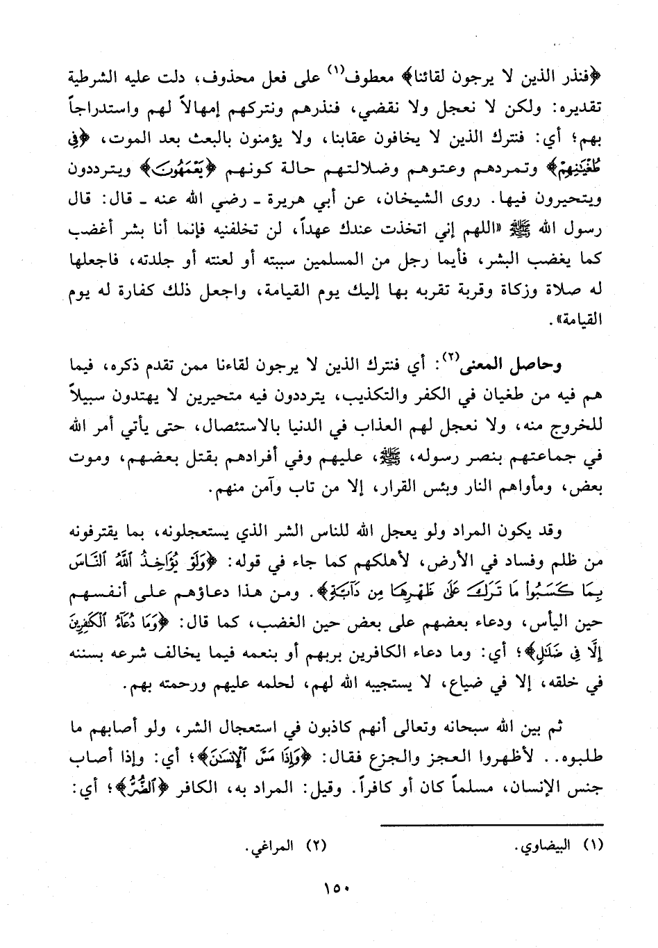{فنذر الذين لا يرجون لقائنا} معطوف (¬1) على فعل محذوف، دلت عليه الشرطية تقديره: ولكن لا نعجل ولا نقضي، فنذرهم ونتركهم إمهالًا لهم واستدراجًا بهم؛ أي: فنترك الذين لا يخافون عقابنا، ولا يؤمنون بالبعث بعد الموت، {فِي طُغْيَانِهِمْ} وتمردهم وعتوهم وضلالتهم حالة كونهم {يَعْمَهُونَ} ويترددون ويتحيرون فيها. روى الشيخان، عن أبي هريرة - رضي الله عنه - قال: قال رسول الله - صلى الله عليه وسلم - "اللهم إني اتخذت عندك عهدًا، لن تخلفنيه فإنما أنا بشر أغضب كما يغضب البشر، فأيما رجل من المسلمين سببته أو لعنته أو جلدته، فاجعلها له صلاة وزكاة وقربة تقربه بها إليك يوم القيامة، واجعل ذلك كفارة له يوم القيامة".