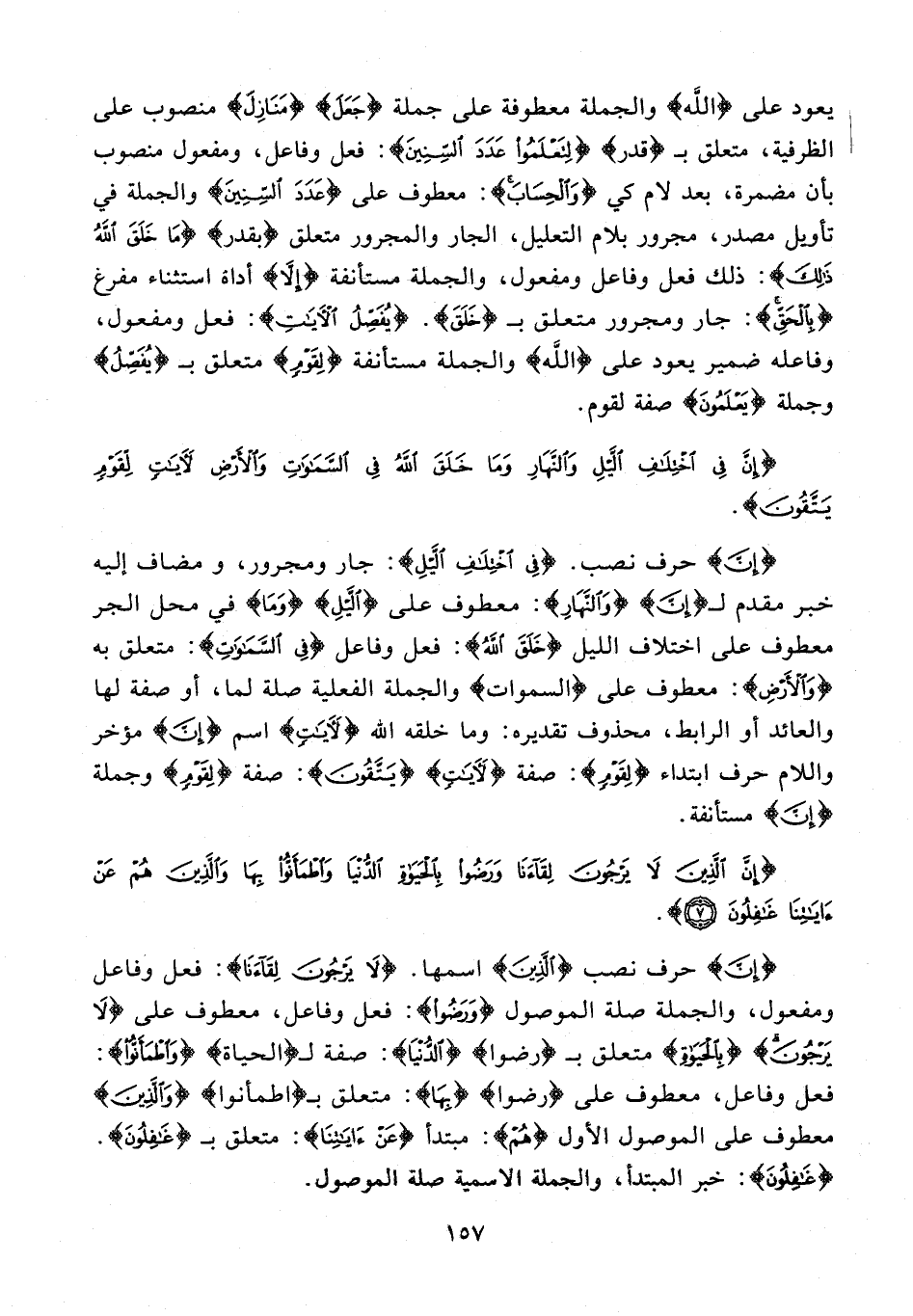 يعود على {الله} والجملة معطوفة على جملة {جَعَلَ} {مَنَازِلَ} منصوب على الظرفية، متعلق بـ {قدر} {لِتَعْلَمُوا عَدَدَ السِّنِينَ}: فعل وفاعل، ومفعول منصوب بأن مضمرة، بعد لام كي {وَالْحِسَابَ}: معطوف على {عَدَدَ السِّنِينَ} والجملة في تأويل مصدر، مجرور بلام التعليل، الجار والمجرور متعلق {بقدر} {مَا خَلَقَ اللَّهُ ذَلِكَ}: ذلك فعل وفاعل ومفعول، والجملة مستأنفة {إِلَّا} أداة استثناء مفرغ {بِالْحَقِّ}: جار ومجرور متعلق بـ {خَلَقَ}. {يُفَصِّلُ الْآيَاتِ}: فعل ومفعول، وفاعله ضمير يعود على {الله} والجملة مستأنفة {لِقَوْمٍ} متعلق بـ {يُفَصِّلُ} وجملة {يَعْلَمُونَ} صفة لقوم.