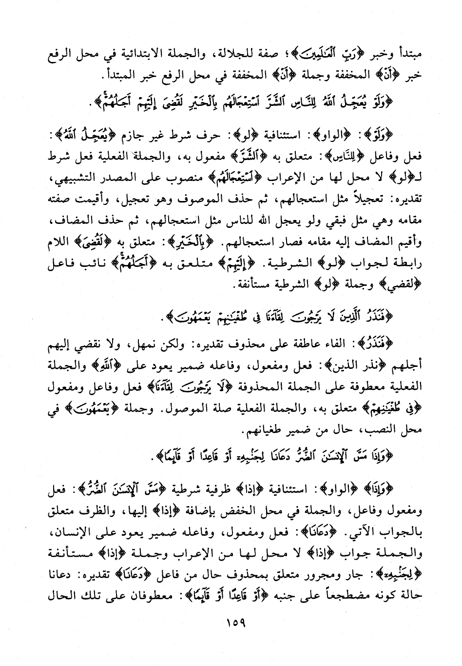 {وَلَوْ}: {الواو}: استئنافية {لو}: حرف شرط غير جازم {يُعَجِّلُ اللَّهُ}: فعل وفاعل {لِلنَّاسِ}: متعلق به {الشَّرَّ} مفعول به، والجملة الفعلية فعل شرط لـ {لو} لا محل لها من الإعراب {اسْتِعْجَالَهُمْ} منصوب على المصدر التشبيهي، تقديره: تعجيلًا مثل استعجالهم، ثم حذف الموصوف وهو تعجيل، وأقيمت صفته مقامه وهي مثل فبقي ولو يعجل الله للناس مثل استعجالهم، ثم حذف المضاف، وأقيم المضاف إليه مقامه فصار استعجالهم. {بِالْخَيْرِ}: متعلق به {لَقُضِيَ} اللام رابطة لجواب {لو} الشرطية. {إِلَيْهِمْ} متلعق به {أَجَلُهُمْ} نائب فاعل {لقضي} وجملة {لو} الشرطية مستأنفة.