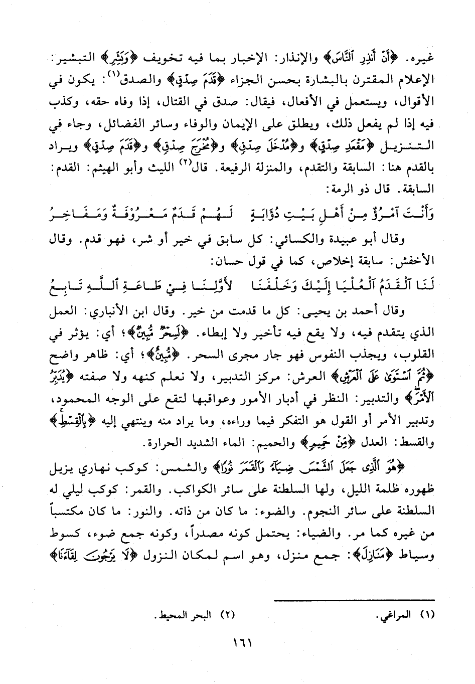 وقال أحمد بن يحيى: كل ما قدمت من خير. وقال ابن الأنباري: العمل الذي يتقدم فيه، ولا يقع فيه تأخير ولا إبطاء. {لَسَاحِرٌ مُبِينٌ}؛ أي: يؤثر في القلوب، ويجذب النفوس فهو جار مجرى السحر. {مُبِينٌ}؛ أي: ظاهر واضح {ثُمَّ اسْتَوَى عَلَى الْعَرْشِ} العرش: مركز التدبير، ولا نعلم كنهه ولا صفته {يُدَبِّرُ الْأَمْر} والتدبير: النظر في أدبار الأمور وعواقبها لتقع على الوجه المحمود، وتدبير الأمر أو القول هو التفكر فيما وراءه، وما يراد منه وينتهي إليه {بِالْقِسْطِ} والقسط: العدل {مِنْ حَمِيمٍ} والحميم: الماء الشديد الحرارة.