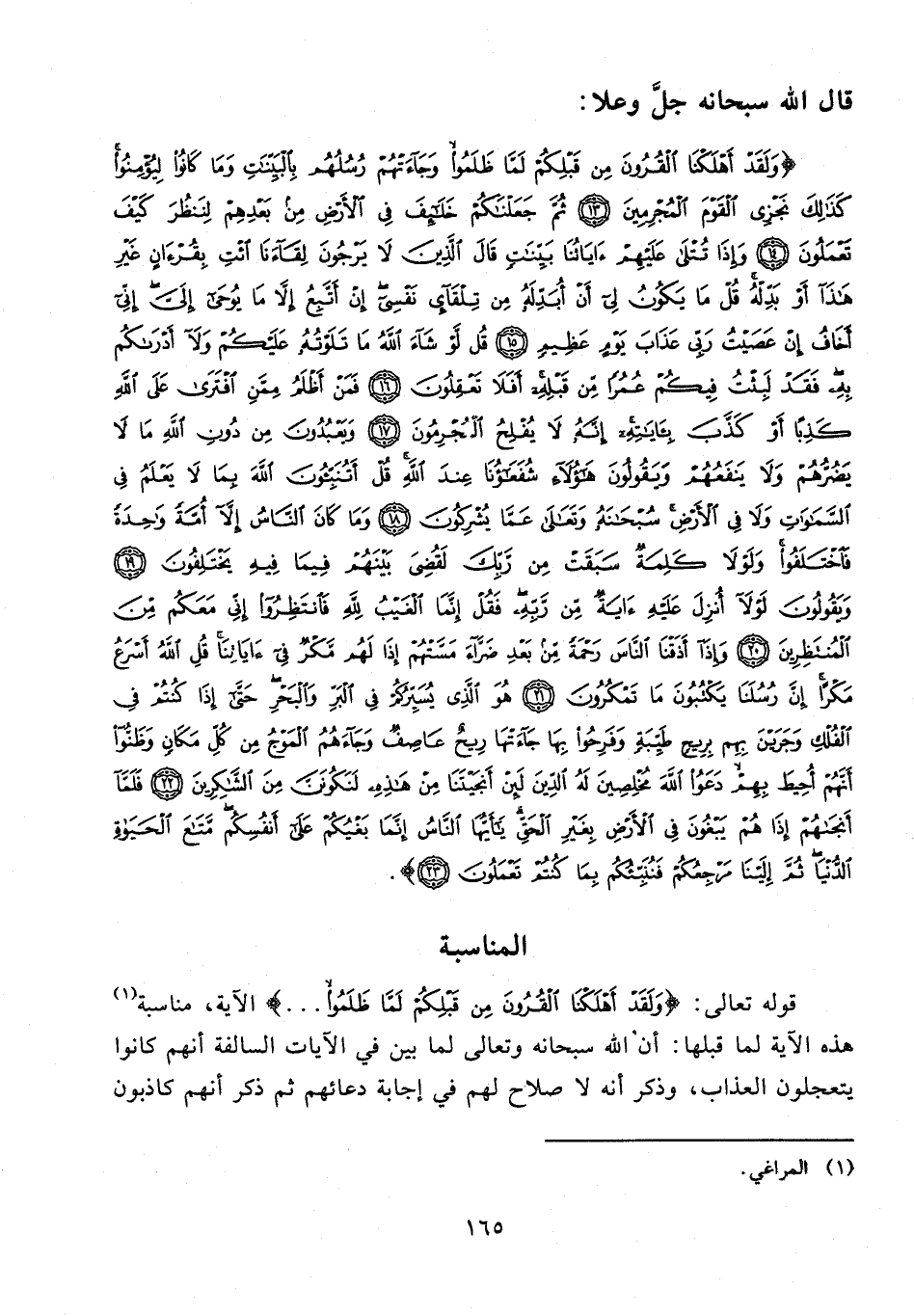 قوله تعالى: {وَلَقَدْ أَهْلَكْنَا الْقُرُونَ مِنْ قَبْلِكُمْ لَمَّا ظَلَمُوا ...} الآية، مناسبة (¬1) هذه الآية لما قبلها: أن الله سبحانه وتعالى لما بين في الآيات السالفة أنهم كانوا يتعجلون العذاب، وذكر أنه لا صلاح لهم في إجابة دعائهم ثم ذكر أنهم كاذبون