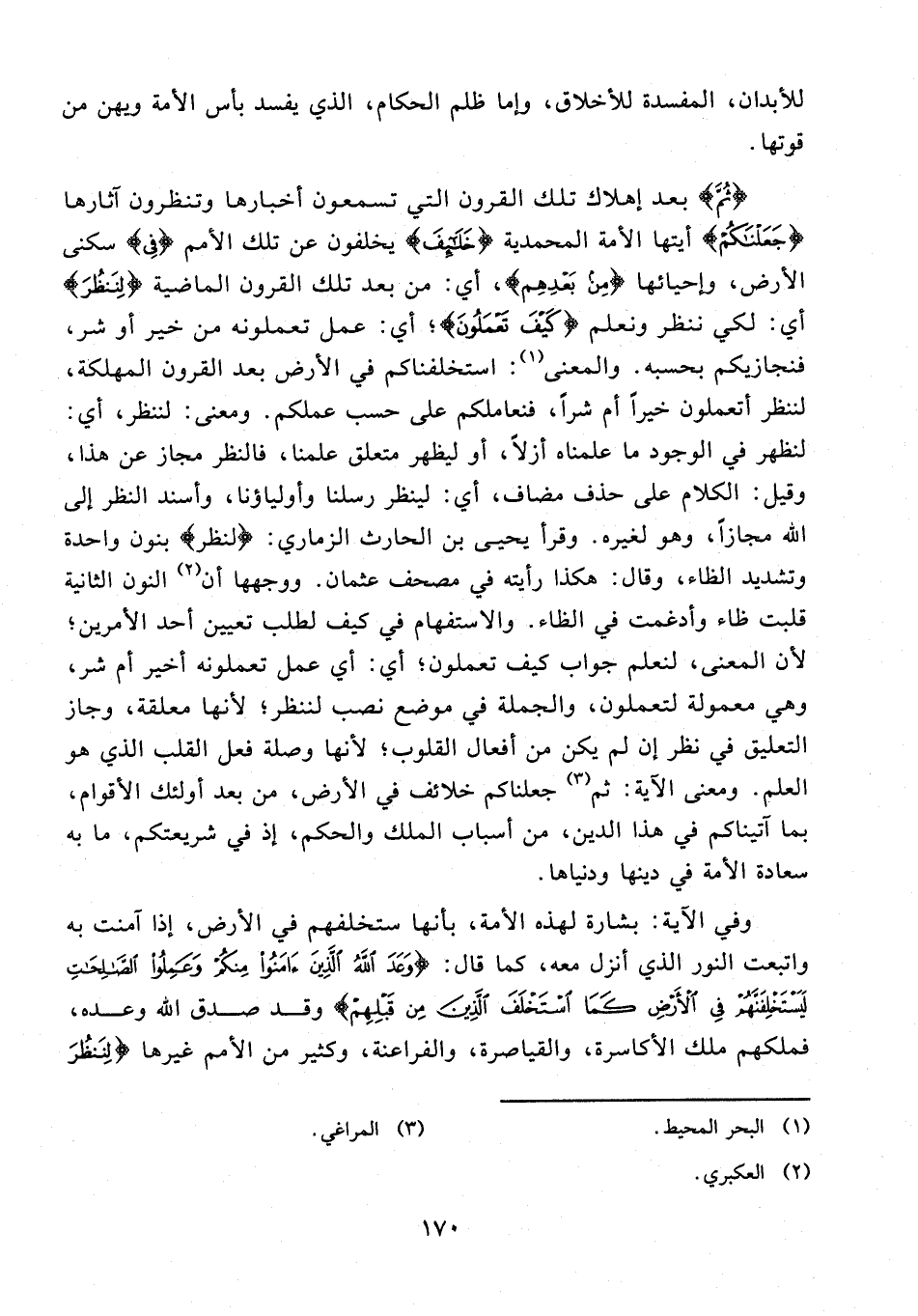 {ثُمَّ} بعد إهلاك تلك القرون التي تسمعون أخبارها وتنظرون آثارها {جَعَلْنَاكُمْ} أيتها الأمة المحمدية {خَلَائِفَ} يخلفون عن تلك الأمم {في} سكنى الأرض، وإحيائها {مِنْ بَعْدِهِمْ}، أي: من بعد تلك القرون الماضية {لِنَنْظُر} أي: لكي ننظر ونعلم {كَيْفَ تَعْمَلُونَ}؛ أي: عمل تعملونه من خير أو شر، فنجازيكم بحسبه. والمعنى (¬1): استخلفناكم في الأرض بعد القرون المهلكة، لننظر أتعملون خيرًا أم شرًّا، فنعاملكم على حسب عملكم. ومعنى: لننظر، أي: لنظهر في الوجود ما علمناه أزلًا، أو ليظهر متعلق علمنا، فالنظر مجاز عن هذا، وقيل: الكلام على حذف مضاف، أي: لينظر رسلنا وأولياؤنا، وأسند النظر إلى الله مجازًا، وهو لغيره. وقرأ يحيى بن الحارث الزماري: {لنظر} بنون واحدة وتشديد الظاء، وقال: هكذا رأيته في مصحف عثمان. ووجهها أن (¬2) النون الثانية قلبت ظاء وأدغمت في الظاء. والاستفهام في كيف لطلب تعيين أحد الأمرين؛ لأن المعنى، لنعلم جواب كيف تعملون؛ أي: أي عمل تعملونه أخير أم شر، وهي معمولة لتعملون، والجملة في موضع نصب لننظر؛ لأنها معلقة، وجاز التعليق في نظر إن لم يكن من أفعال القلوب؛ لأنها وصلة فعل القلب الذي هو العلم. ومعنى الآية: ثم (¬3) جعلناكم خلائف في الأرض، من بعد أولئك الأقوام، بما آتيناكم في هذا الدين، من أسباب الملك والحكم، إذ في شريعتكم، ما به سعادة الأمة في دينها ودنياها.