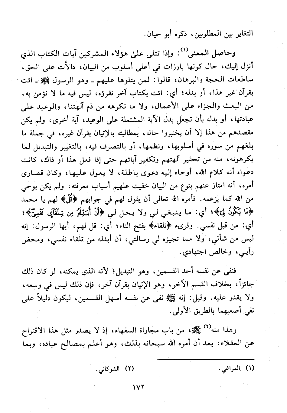 فنفى عن نفسه أحد القسمين، وهو التبديل؛ لأنه الذي يمكنه، لو كان ذلك جائزًا، بخلاف القسم الآخر، وهو الإتيان بقرآن آخر، فإن ذلك ليس في وسعه، ولا يقدر عليه. وقيل: إنه - صلى الله عليه وسلم - نفى عن نفسه أسهل القسمين، ليكون دليلًا على نفي أصعبهما بالطريق الأولى.