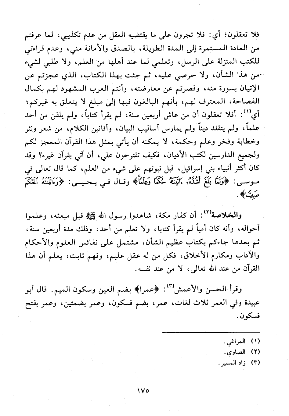 وقرأ الحسن والأعمش (¬3): {عمرا} بضم العين وسكون الميم. قال أبو عبيدة وفي العمر ثلاث لغات، عمر، بضم فسكون، وعمر بضمتين، وعمر بفتح فسكون.