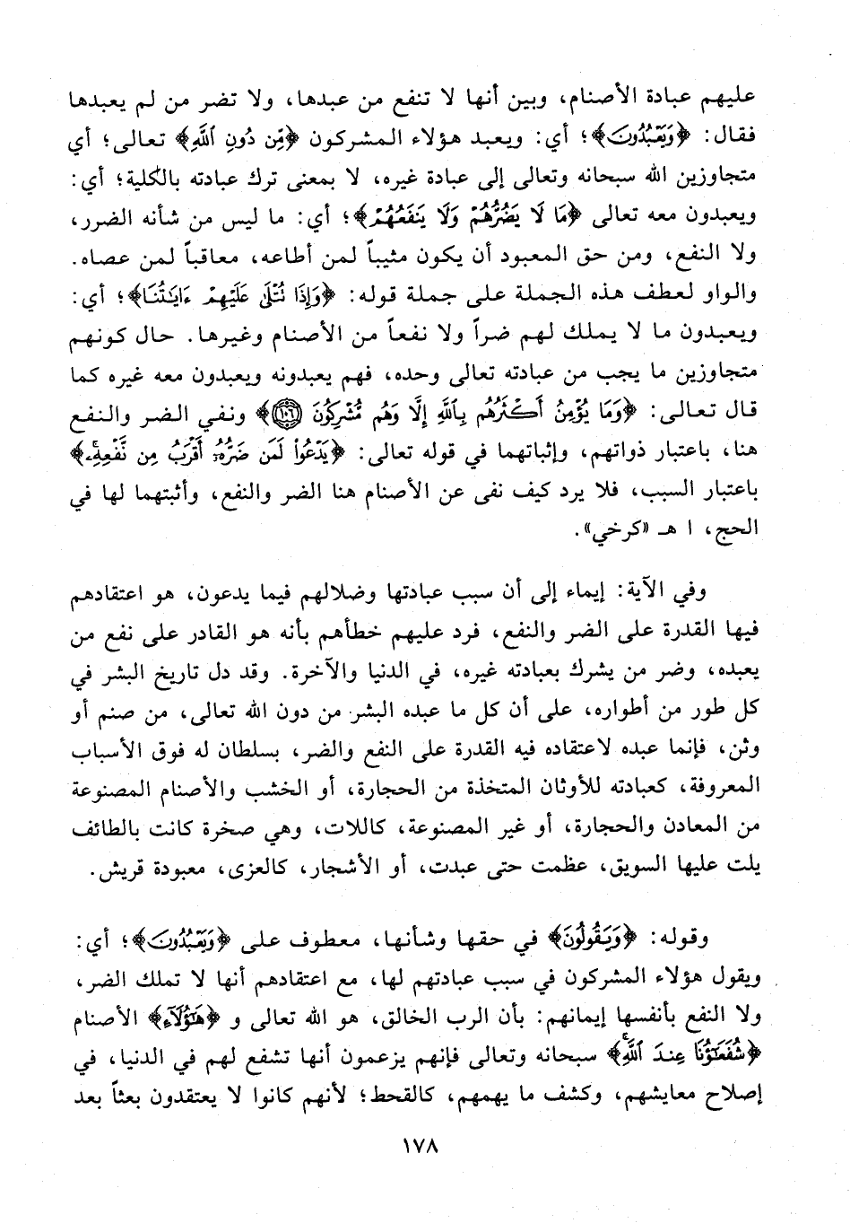عليهم عبادة الأصنام، وبين أنها لا تنفع من عبدها، ولا تضر من لم يعبدها فقال: {وَيَعْبُدُونَ}؛ أي: ويعبد هؤلاء المشركون {مِنْ دُونِ اللَّهِ} تعالى؛ أي متجاوزين الله سبحانه وتعالى إلى عبادة غيره، لا بمعنى ترك عبادته بالكلية؛ أي: ويعبدون معه تعالى {مَا لَا يَضُرُّهُمْ وَلَا يَنْفَعُهُمْ}؛ أي: ما ليس من شأنه الضرر، ولا النفع، ومن حق المعبود أن يكون مثيبًا لمن أطاعه، معاقبًا لمن عصاه. والواو لعطف هذه الجملة على جملة قوله: {وَإِذَا تُتْلَى عَلَيْهِمْ آيَاتُنَا}؛ أي: ويعبدون ما لا يملك لهم ضرًّا ولا نفعًا من الأصنام وغيرها. حال كونهم متجاوزين ما يجب من عبادته تعالى وحده، فهم يعبدونه ويعبدون معه غيره كما قال تعالى: {وَمَا يُؤْمِنُ أَكْثَرُهُمْ بِاللَّهِ إِلَّا وَهُمْ مُشْرِكُونَ (106)} ونفي التفسير والنفع هنا، باعتبار ذواتهم، وإثباتهما في قوله تعالى: {يَدْعُو لَمَنْ ضَرُّهُ أَقْرَبُ مِنْ نَفْعِهِ} باعتبار السبب، فلا يرد كيف نفى عن الأصنام هنا التفسير والنفع، وأثبتهما لها في الحج، اهـ "كرخي".