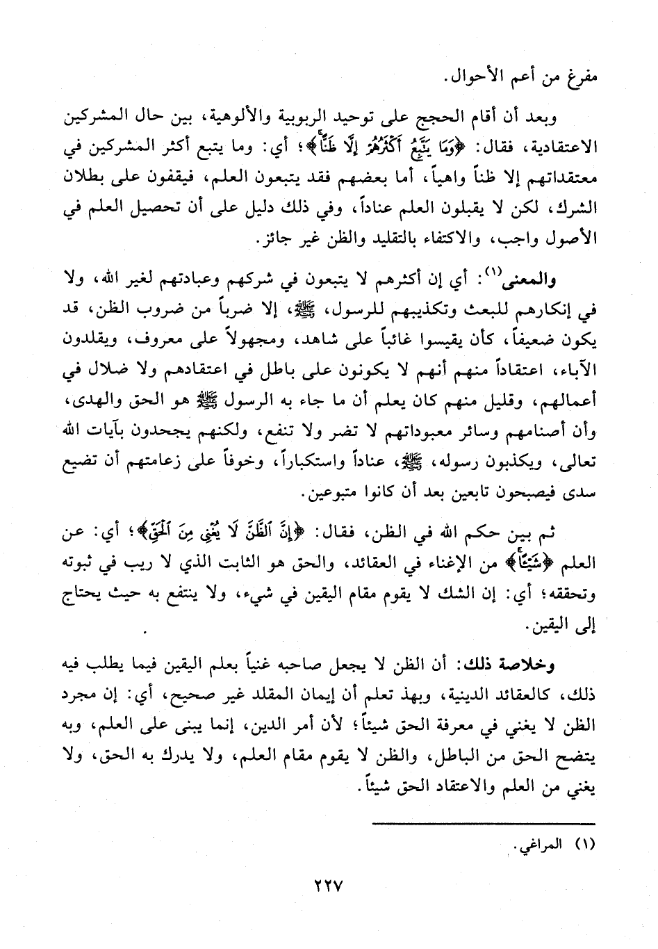 وخلاصة ذلك: أن الظن لا يجعل صاحبه غنيًّا بعلم اليقين فيما يطلب فيه ذلك، كالعقائد الدينية، وبهذ تعلم أن إيمان المقلد غير صحيح، أي: إن مجرد الظن لا يغني في معرفة الحق شيئًا؛ لأن أمر الدين، إنما يبنى على العلم، وبه يتضح الحق من الباطل، والظن لا يقوم مقام العلم، ولا يدرك به الحق، ولا يغني من العلم والاعتقاد الحق شيئًا.