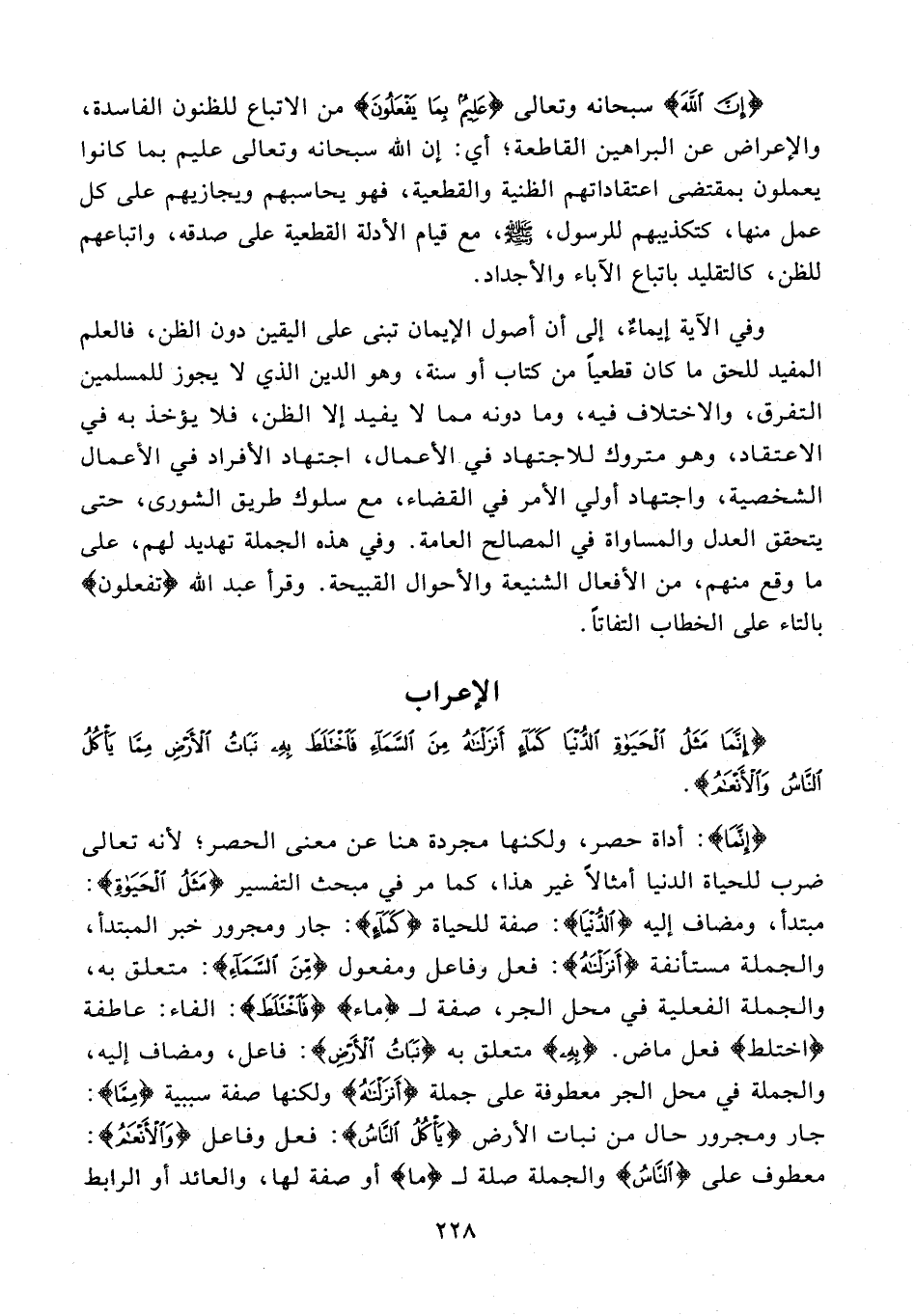 {إِنَّمَا}: أداة حصر، ولكنها مجردة هنا عن معنى الحصر؛ لأنه تعالى ضرب للحياة الدنيا أمثالًا غير هذا، كما مر في مبحث التفسير {مَثَلُ الْحَيَاةِ}: مبتدأ، ومضاف إليه {الدُّنْيَا}: صفة للحياة {كَمَاءٍ}: جار ومجرور خبر المبتدأ، والجملة مستأنفة {أَنْزَلْنَاهُ}: فعل وفاعل ومفعول {مِنَ السَّمَاءِ}: متعلق به، والجملة الفعلية في محل الجر، صفة لـ {أمَاءٍ} {فَاخْتَلَطَ}: الفاء: عاطفة {اختلط} فعل ماض. {بِهِ} متعلق به {نَبَاتُ الْأَرْضِ}: فاعل، ومضاف إليه، والجملة في محل الجر معطوفة على جملة {أَنْزَلْنَاهُ} ولكنها صفة سببية هِنَا: جار ومجرور حال من نبات الأرض {يَأْكُلُ النَّاسُ}: فعل وفاعل {وَالْأَنْعَامُ}: معطوف على {النَّاسُ} والجملة صلة لـ {ما} أو صفة لها، والعائد أو الرابط