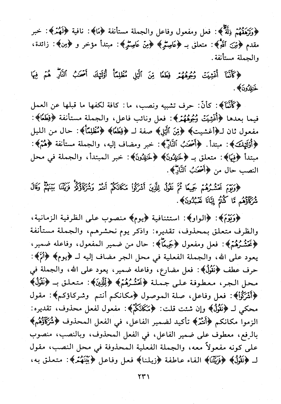 {كَأَنَّمَا}: {كَأَنّ}: حرف تشبيه ونصب، ما: كافة لكفها ما قبلها عن العمل فيما بعدها {أُغْشِيَتْ وُجُوهُهُمْ}: فعل ونائب فاعل، والجملة مستأنفة {قِطَعًا}: مفعول ثان لـ {أُغْشِيَتْ} {مِنَ اللَّيْلِ} صفة لـ {قِطَعًا} {مُظْلِمًا}: حال من الليل {أُولَئِكَ}: مبتدأ. {أَصْحَابُ النَّارِ}: خبر ومضاف إليه، والجملة مستأنفة {هُمْ}: مبتدأ {فِيهَا}: متعلق بـ {خَالِدُونَ} {خَالِدُونَ}: خبر المبتدأ، والجملة في محل النصب حال من {أَصْحَابُ النَّارِ}.
