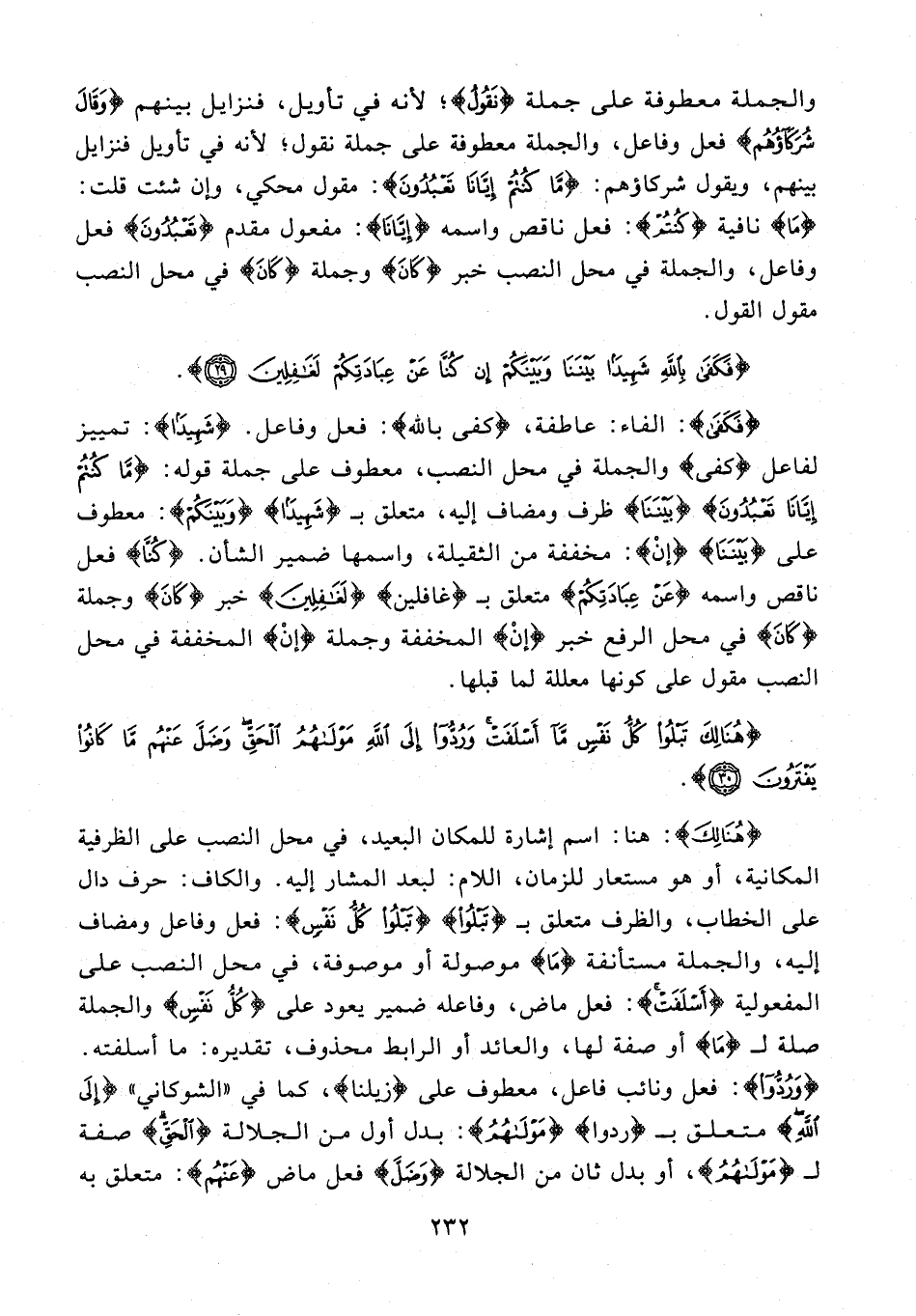 {هُنَالِكَ}: هنا: اسم إشارة للمكان البعيد، في محل النصب على الظرفية المكانية، أو هو مستعار للزمان، اللام: لبعد المشار إليه. والكاف: حرف دال على الخطاب، والظرف متعلق بـ {تَبْلُو} {تَبْلُو كُلُّ نَفْسٍ}: فعل وفاعل ومضاف إليه، والجملة مستأنفة {مَا} موصولة أو موصوفة، في محل النصب على المفعولية {أَسْلَفَتْ}: فعل ماض، وفاعله ضمير يعود على {كُلُّ نَفْسٍ} والجملة صلة لـ {مَا} أو صفة لها، والعائد أو الرابط محذوف، تقديره: ما أسلفته. {وَرُدُّوا}: فعل ونائب فاعل، معطوف على {زيلنا}، كما في "الشوكاني" {إِلَى اللَّهِ} متعلق بـ {ردوا} {مَوْلَاهُمُ}: بدل أول من الجلالة {الْحَقِّ} صفة لـ {مَوْلَاهُمُ}، أو بدل ثان من الجلالة {وَضَلَّ} فعل ماض {عَنْهُمْ}: متعلق به