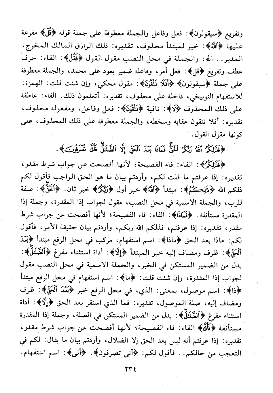 وتفريع {سَيَقُولُونَ}: فعل وفاعل والجملة معطوفة على جملة قوله {قُلْ} مفرعة عليها {اللَّهُ}: خبر لمبتدأ محذوف، تقديره: ذلك الرازق المالك المخرج، المدبر .. الله، والجملة في محل النصب مقول القول {فَقُلْ}: الفاء: حرف عطف وتفريع {قل}: فعل أمر، وفاعله ضمير يعود على محمَّد، والجملة معطوفة على جملة {سيقولون} {أَفَلَا تَتَّقُون}: مقول محكي، وإن شئت قلت: الهمزة: للاستفهام التوبيخي، داخلة على محذوف، تقديره: أتعلمون ذلك. الفاء: عاطفة على ذلك المحذوف {لَا}: نافية {تَتَّقُونَ}: فعل وفاعل، ومفعوله محذوف، تقديره: أفلا تتقون عقابه وسخطه، والجملة معطوفة على ذلك المحذوف، على كونها مقول القول.