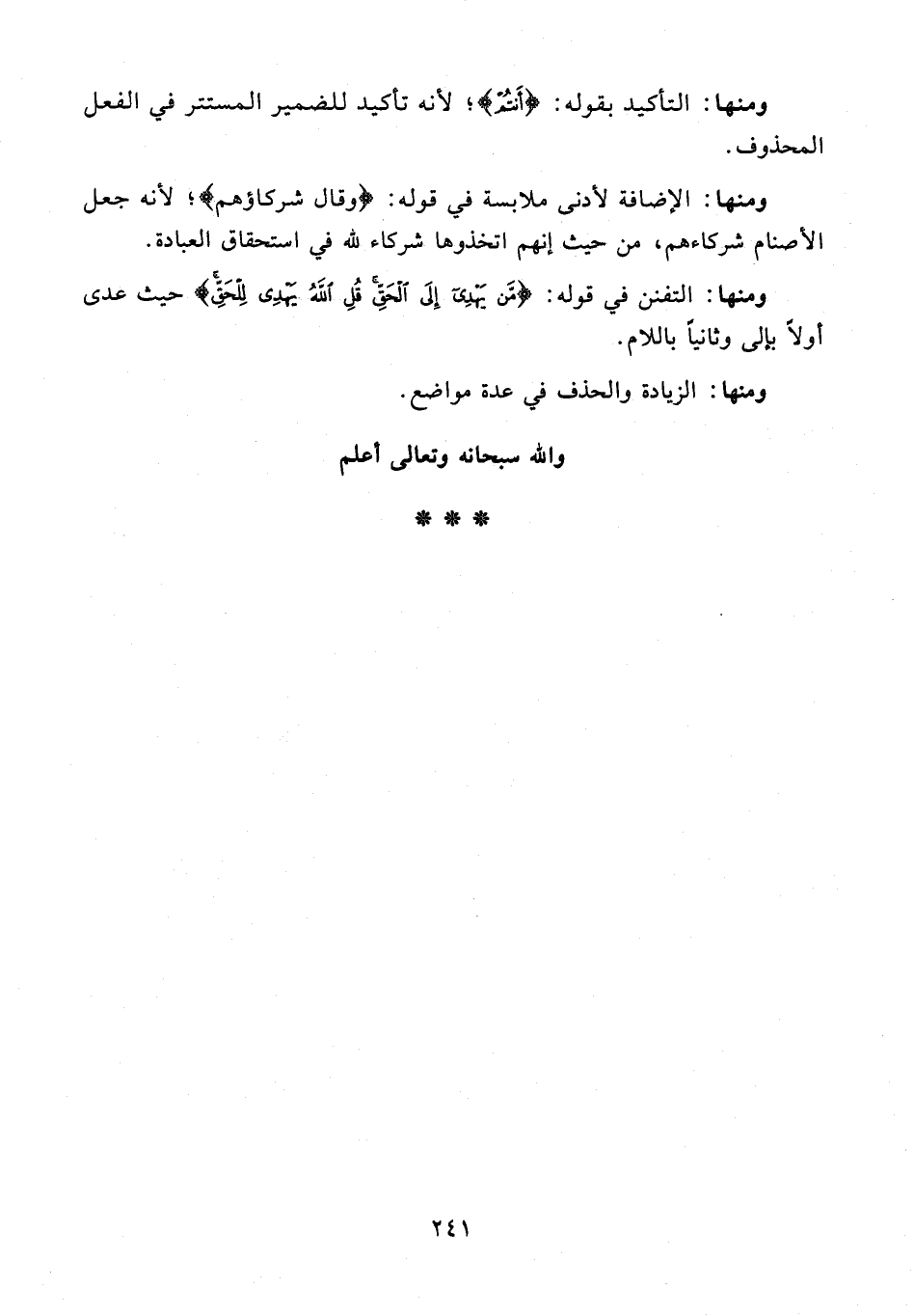 ومنها: الإضافة لأدنى ملابسة في قوله: {وقال شركاؤهم}؛ لأنه جعل الأصنام شركاءهم، من حيث إنهم اتخذوها شركاء لله في استحقاق العبادة.