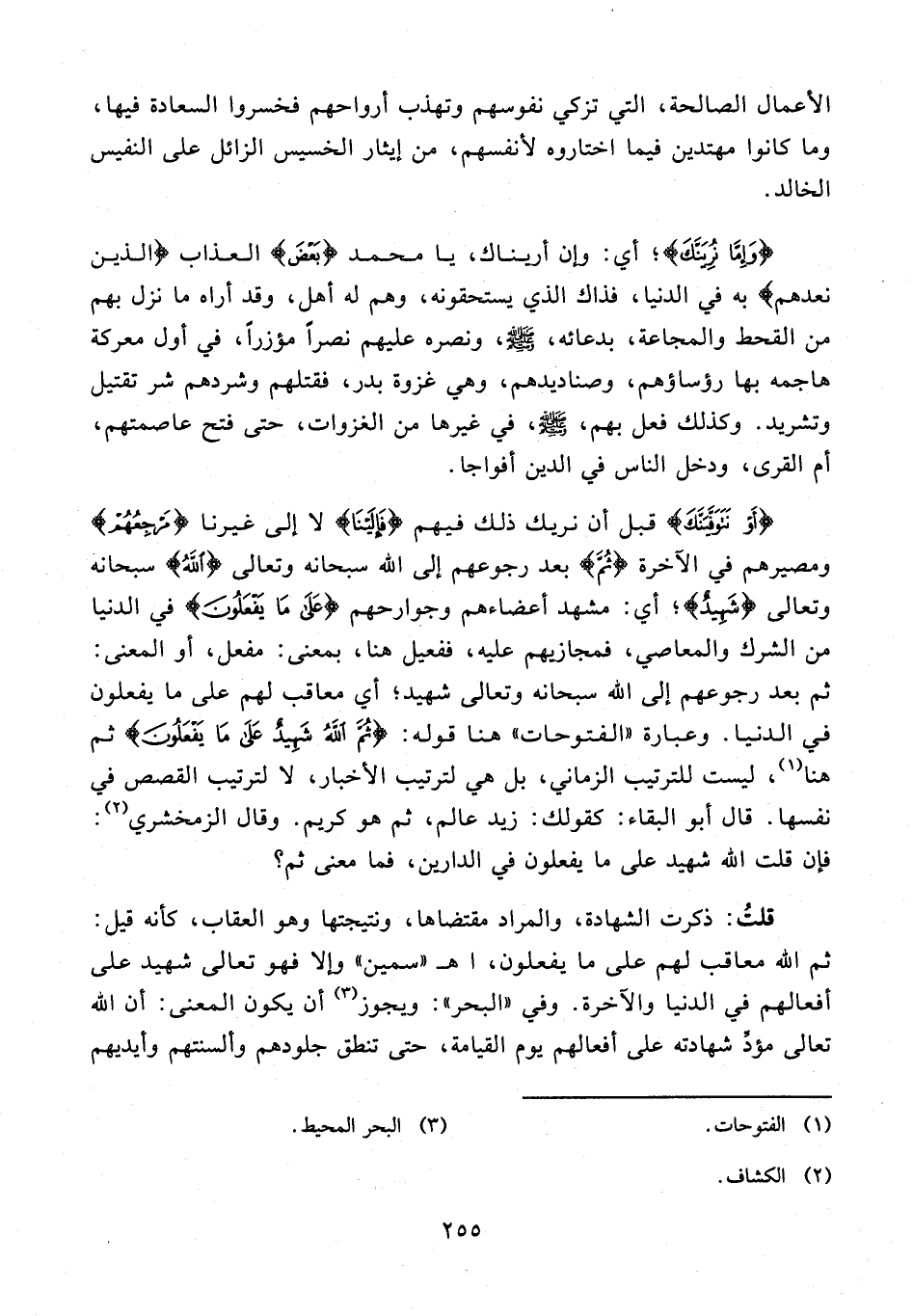 {أَوْ نَتَوَفَّيَنَّكَ} قبل أن نريك ذلك فيهم {فَإِلَيْنَا} لا إلى غيرنا {مَرْجِعُهُمْ} ومصيرهم في الآخرة {ثُمَّ} بعد رجوعهم إلى الله سبحانه وتعالى {اللَّهُ} سبحانه وتعالى {شَهِيدٌ}؛ أي: مشهد أعضاءهم وجوارحهم {عَلَى مَا يَفْعَلُونَ} في الدنيا من الشرك والمعاصي، فمجازيهم عليه، ففعيل هنا، بمعنى: مفعل، أو المعنى: ثم بعد رجوعهم إلى الله سبحانه وتعالى شهيد؛ أي معاقب لهم على ما يفعلون في الدنيا. وعبارة "الفتوحات" هنا قوله: {ثُمَّ اللَّهُ شَهِيدٌ عَلَى مَا يَفْعَلُونَ} ثم هنا (¬1)، ليست للترتيب الزماني، بل هي لترتيب الأخبار، لا لترتيب القصص في نفسها. قال أبو البقاء: كقولك: زيد عالم، ثم هو كريم. وقال الزمخشري (¬2): فإن قلت الله شهيد على ما يفعلون في الدارين، فما معنى ثم؟