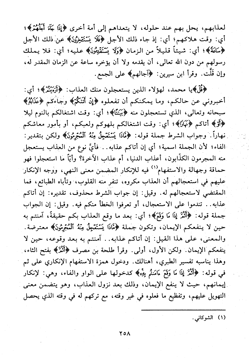 51 - {أثُمَّ إِذَا مَا وَقَعَ}؛ أي: بعد ما وقع العذاب بكم حقيقةً، آمنتم به حين لا ينفعكم الإيمان، وتكون جملة {مَاذَا يَسْتَعْجِلُ مِنْهُ الْمُجْرِمُونَ} معترضة. والمعنى، على هذا القيل: إن أتاكم عذابه .. آمنتم به بعد وقوعه، حين لا ينفعكم الإيمان. ولكن الأول، أولى. وقرأ طلحة بن مصرف {أثُمَّ} بفتح الثاء، وهذا يناسبه تفسير الطبري، أهنالك. ودخول همزة الاستفهام الإنكاري على ثم في قوله: {أثُمَّ إِذَا مَا وَقَعَ آمَنْتُمْ بِهِ} كدخولها على الواو والفاء، وهي: لإنكار إيمانهم، حيث لا ينفع الإيمان، وذلك بعد نزول العذاب، وهو يتضمن معنى التهويل عليهم، وتفظيع ما فعلوه في غير وقته، مع تركهم له في وقته الذي يحصل