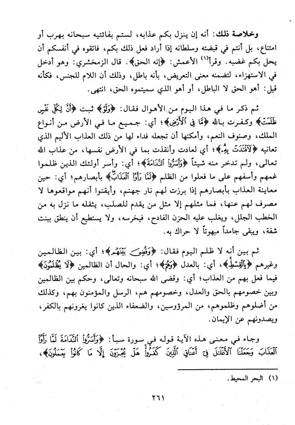 54 - ثم ذكر ما في هذا اليوم من الأهوال فقال: {وَلَوْ} ثبت {أَنَّ لِكُلِّ نَفْسٍ ظَلَمَتْ} وكفرت بالله {مَا فِي الْأَرْضِ}؛ أي: جميع ما في الأرض من أنواع الملك، وصنوف النعم، وأمكنها أن تجعله فداء لها من ذلك العذاب الأليم الذي تعانيه {لَافْتَدَتْ بِهِ}؛ أي لعادت وأنقذت بما في الأرض نفسها، من عذاب الله تعالى، ولم تدخر منه شيئًا {وَأَسَرُّوا النَّدَامَةَ}؛ أي: وأسر أولئك الذين ظلموا غمهم وأسفهم على ما فعلوا من الظلم {لَمَّا رَأَوُا الْعَذَابَ} بأبصارهم؛ أي: حين معاينة العذاب بأبصارهم إذا برزت لهم نار جهنم، وأيقنوا أنهم مواقعوها لا مصرف لهم عنها، فما مثلهم إلا مثل من يقدم للصلب، يثقله ما نزل به من الخطب الجلل، ويغلب عليه الحزن الفادح، فيخرسه، ولا يستطيع أن ينطق ببنت شفة، ويبقى جامدًا مبهوتًا لا حراك به.