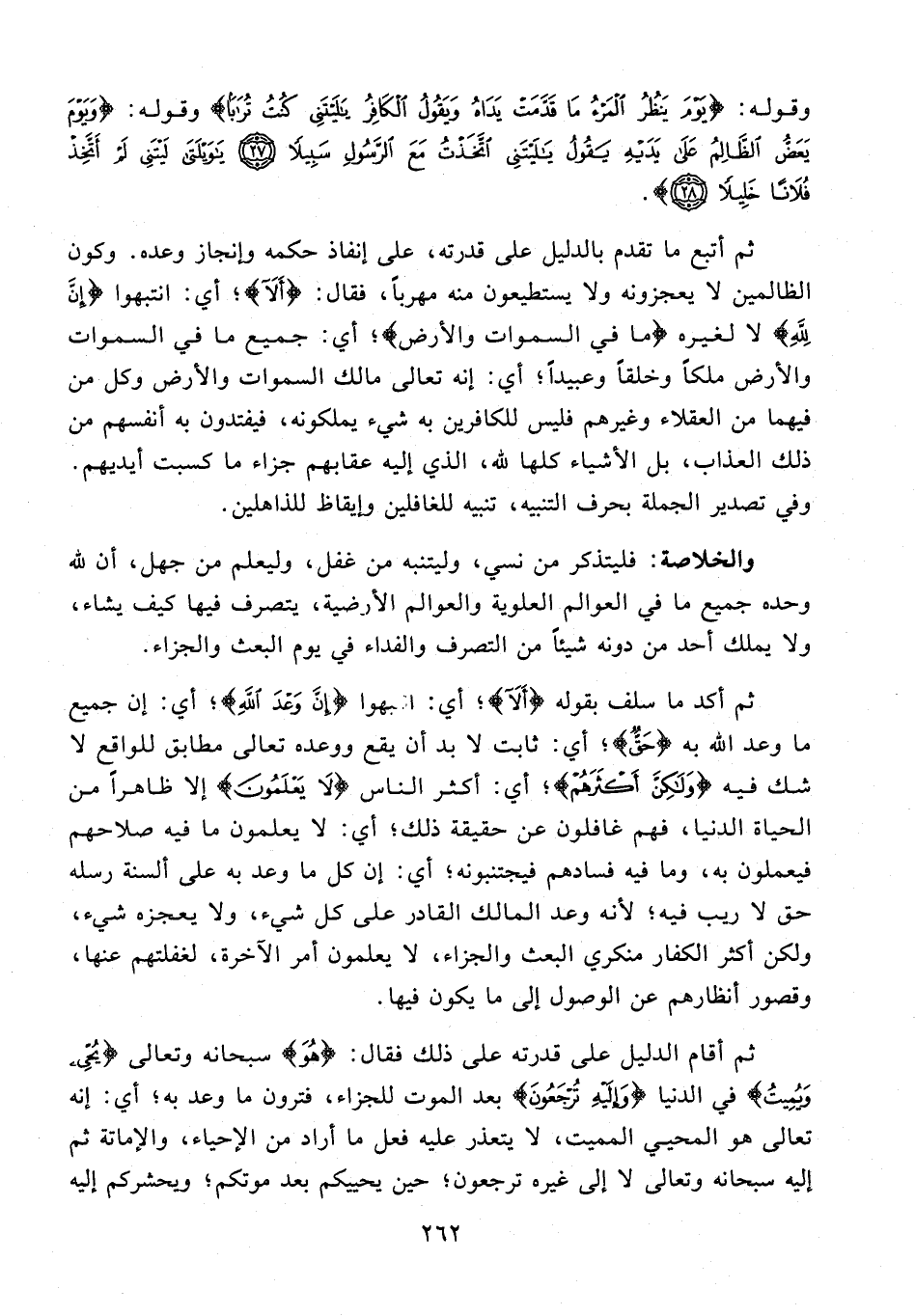 والخلاصة: فليتذكر من نسي، وليتنبه من غفل، وليعلم من جهل، أن لله وحده جميع ما في العوالم العلوية والعوالم الأرضية، يتصرف فيها كيف يشاء، ولا يملك أحد من دونه شيئًا من التصرف والفداء في يوم البعث والجزاء.