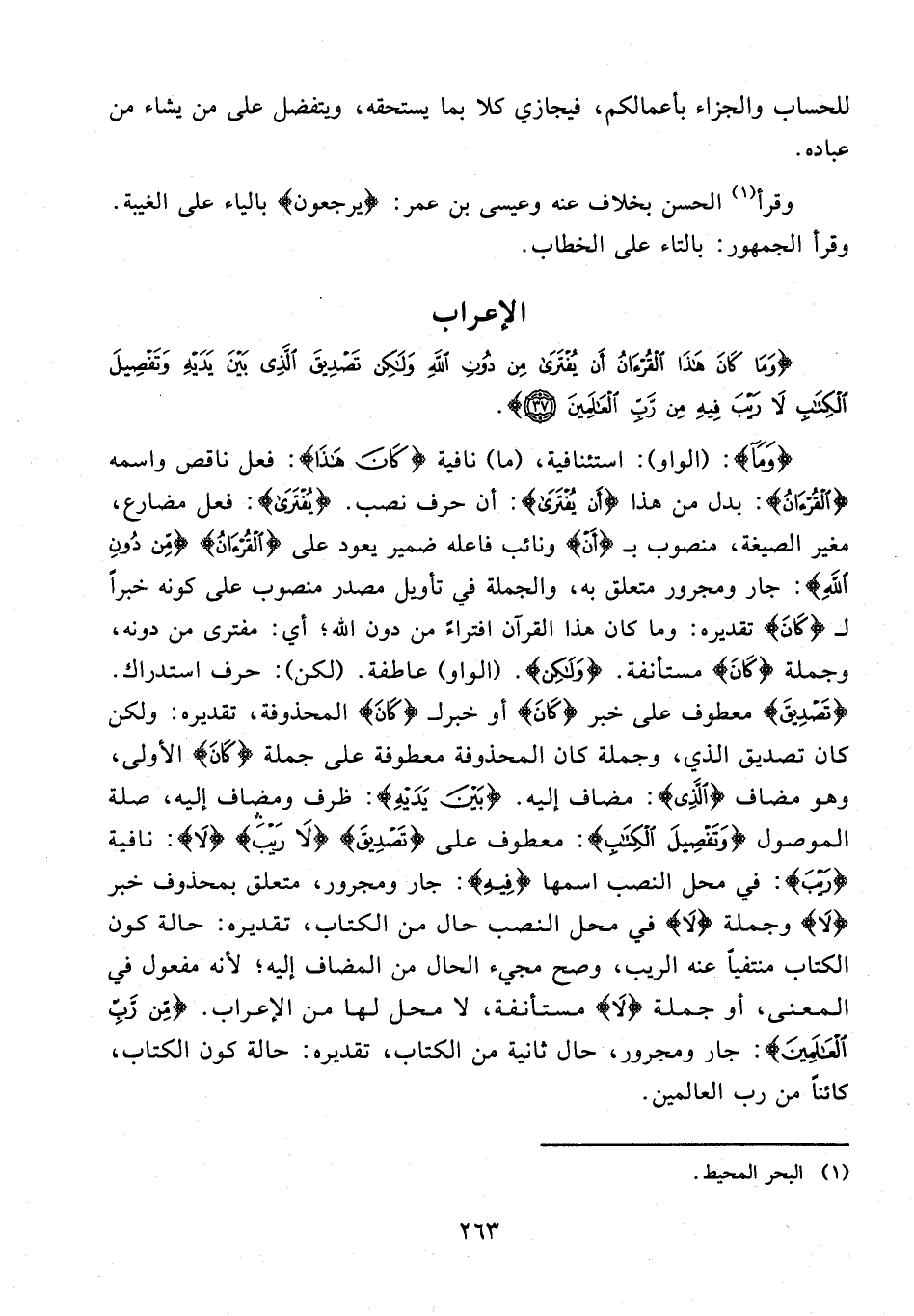 {وَمَا}: {الواو}: استئنافية، {ما} نافية {كَانَ هَذَا}: فعل ناقص واسمه {الْقُرْآنُ}: بدل من هذا {أَنْ يُفْتَرَى}: أن حرف نصب. {يُفْتَرَى}: فعل مضارع، مغير الصيغة، منصوب بـ {أَنْ} ونائب فاعله ضمير يعود على {الْقُرْآنُ} {مِنْ دُونِ اللَّهِ}: جار ومجرور متعلق به، والجملة في تأويل مصدر منصوب على كونه خبرًا لـ {كَانَ} تقديره: وما كان هذا القرآن افتراءً من دون الله؛ أي: مفترى من دونه، وجملة {كَانَ} مستأنفة. {وَلَكِنْ}. {الواو} عاطفة. {لكن}: حرف استدراك. {تَصْدِيقَ} معطوف على خبر {كَانَ} أو خبر لـ {كَانَ} المحذوفة، تقديره: ولكن كان تصديق الذي، وجملة كان المحذوفة معطوفة على جملة {كَانَ} الأولى، وهو مضاف {الَّذِي}: مضاف إليه. {بَيْنَ يَدَيْهِ}: ظرف ومضاف إليه، صلة الموصول {وَتَفْصِيلَ الْكِتَابِ}: معطوف على {تَصْدِيقَ} {لَا رَيْبَ} {لَا}: نافية {رَيْبَ}: في محل النصب اسمها {فِيهِ}: جار ومجرور، متعلق بمحذوف خبر {لَا} وجملة {لَا} في محل النصب حال من الكتاب، تقديره: حالة كون الكتاب منتفيًا عنه الريب، وصح مجيء الحال من المضاف إليه؛ لأنه مفعول في المعنى، أو جملة {لَا} مستأنفة، لا محل لها من الإعراب. {مِنْ رَبِّ الْعَالَمِينَ}: جار ومجرور، حال ثانية من الكتاب، تقديره: حالة كون الكتاب، كائنًا من رب العالمين.