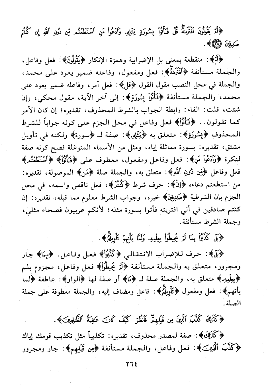 {أَمْ}: منقطعة بمعنى بل الإضرابية وهمزة الإنكار {يَقُولُونَ}: فعل وفاعل، والجملة مستأنفة {افْتَرَاهُ}: فعل ومفعول، وفاعله ضمير يعود على محمَّد، والجملة في محل النصب مقول القول {قل}: فعل أمر، وفاعله ضمير يعود على محمد، والجملة مستأنفة {فَأْتُوا بِسُورَةٍ}: إلى آخر الآية، مقول محكي، وإن شئت، قلت: الفاء: رابطة الجواب بالشرط المحذوف، تقديره؛ إن كان الأمر كما تقولون .. {فَأْتُوا} فعل وفاعل في محل الجزم على كونه جوابًا للشرط المحذوف {بِسُورَةٍ}: متعلق به {مِثْلِهِ}: صفة لـ {سورة} ولكنه في تأويل مشتق، تقديره: بسورة مماثلة إياه، ومثل من الأسماء المتوغلة فصح كونه صفة لنكرة {وَادْعُوا مَنِ}: فعل وفاعل ومفعول، معطوف على {فَأْتُوا} {اسْتَطَعْتُمْ} فعل وفاعل {مِنْ دُونِ اللَّهِ}: متعلق به، والجملة صلة {مَن} الموصولة، تقديره: من استطعتم دعاءه {إنْ}: حرف شرط {كُنْتُمْ}، فعل ناقص واسمه، في محل الجزم بإن الشرطية {صَادِقِينَ} خبره، وجواب الشرط معلوم مما قبله، تقديره: إن كنتم صادقين في أني افتريته فأتوا بسورة مثله؛ لأنكم عربيون فصحاء مثلي، وجملة الشرط مستأنفة.
