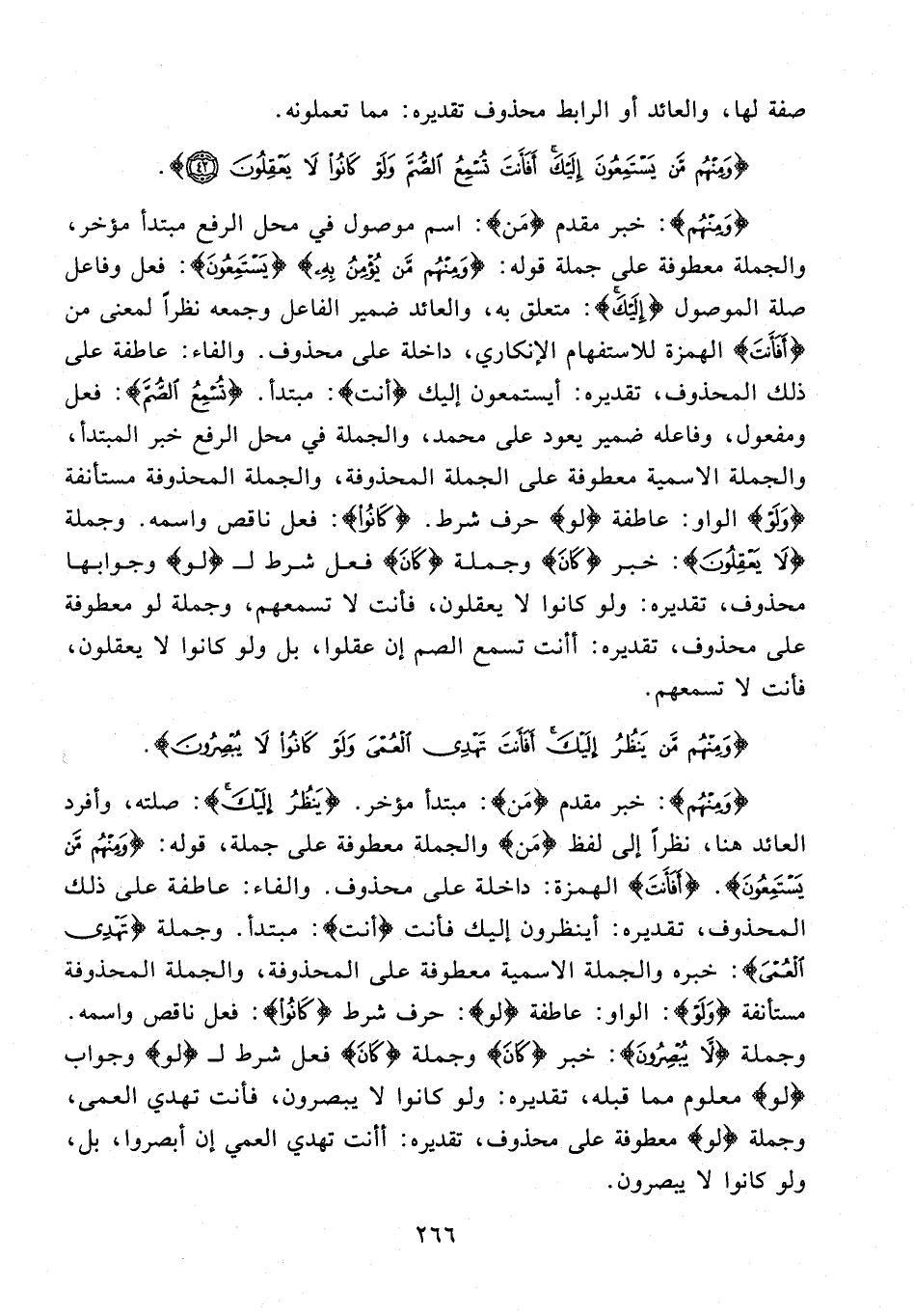 {وَمِنْهُمْ}: خبر مقدم {مَنْ}: اسم موصول في محل الرفع مبتدأ مؤخر، والجملة معطوفة على جملة قوله: {وَمِنْهُمْ مَنْ يُؤْمِنُ بِهِ} {يَسْتَمِعُونَ}: فعل وفاعل صلة الموصول {إِلَيْكَ}: متعلق به، والعائد ضمير الفاعل وجمعه نظرًا لمعنى من {أَفَأَنْتَ} الهمزة للاستفهام الإنكاري، داخلة على محذوف. والفاء: عاطفة على ذلك المحذوف، تقديره: أيستمعون إليك {أنت}: مبتدأ. {تُسْمِعُ الصُّمَّ}: فعل ومفعول، وفاعله ضمير يعود على محمَّد، والجملة في محل الرفع خبر المبتدأ، والجملة الاسمية معطوفة على الجملة المحذوفة، والجملة المحذوفة مستأنفة {وَلَوْ} الواو: عاطفة {لو} حرف شرط. {كَانُوا}: فعل ناقص واسمه. وجملة {لَا يَعْقِلُونَ}: خبر {كَانَ} وجملة {كَانَ} فعل شرط لـ {لو} وجوابها محذوف، تقديره: ولو كانوا لا يعقلون، فأنت لا تسمعهم، وجملة لو معطوفة على محذوف، تقديره: أأنت تسمع الصم إن عقلوا، بل ولو كانوا لا يعقلون، فأنت لا تسمعهم.