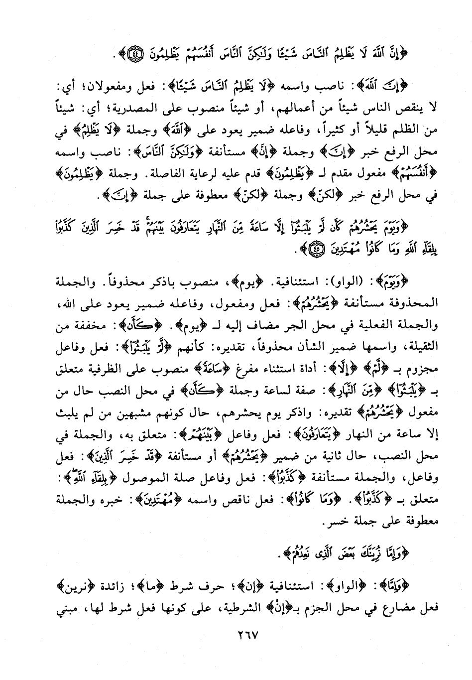 {إِنَّ اللَّهَ}: ناصب واسمه {لَا يَظْلِمُ النَّاسَ شَيْئًا}: فعل ومفعولان؛ أي: لا ينقص الناس شيئًا من أعمالهم، أو شيئًا منصوب على المصدرية؛ أي: شيئًا من الظلم قليلًا أو كثيرًا، وفاعله ضمير يعود على {اللَّهَ} وجملة {لَا يَظْلِمُ} في محل الرفع خبر {إِنَّ} وجملة {إنَّ} مستأنفة {وَلَكِنَّ النَّاسَ}: ناصب واسمه {أنفسهم} مفعول مقدم لـ {يَظلِمُونَ} قدم عليه لرعاية الفاصلة. وجملة {يَظْلِمُونَ} في محل الرفع خبر {لَكِنَّ} وجملة {لَكِنَّ} معطوفة على جملة {إِنَّ}.