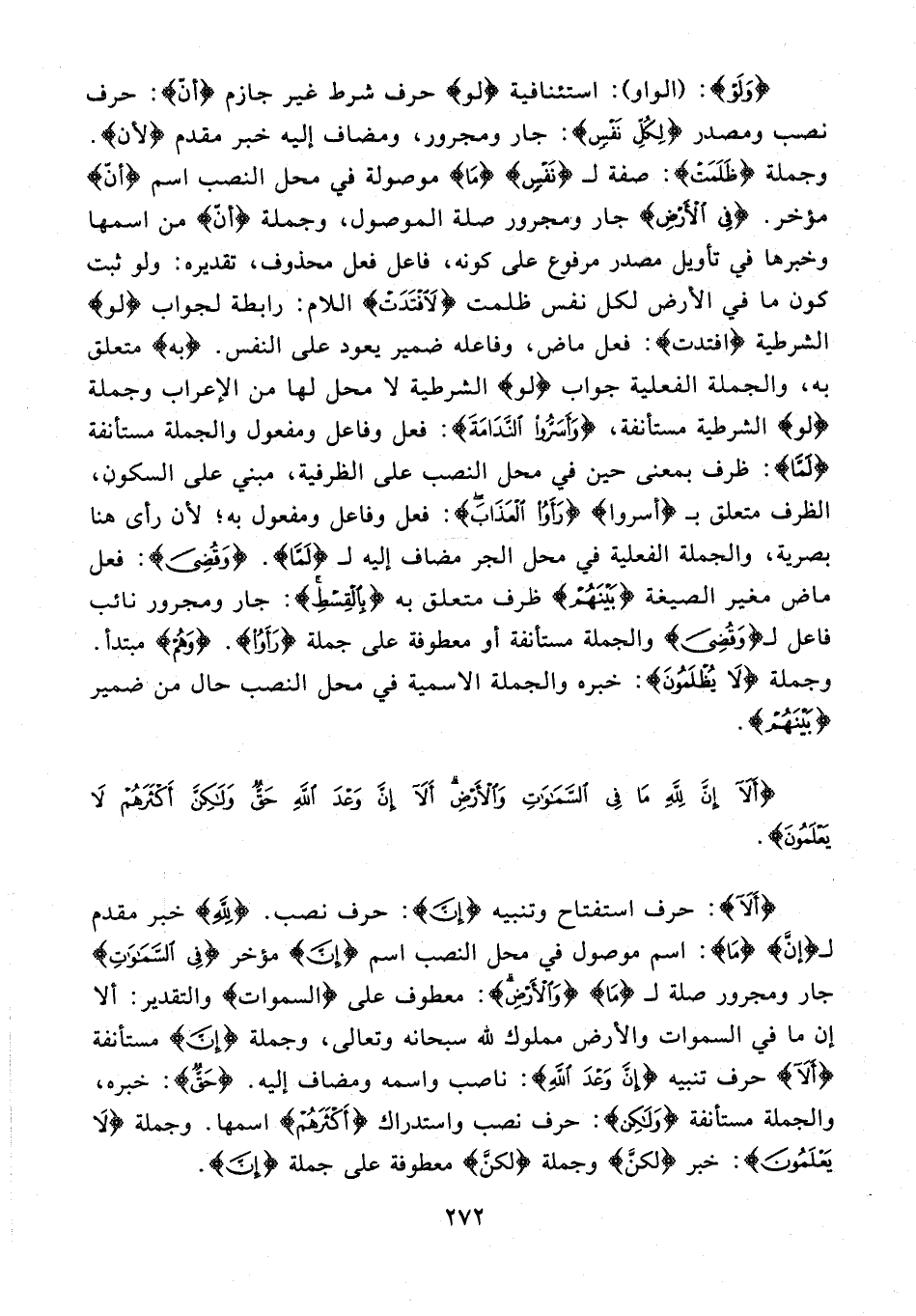 {وَلَوْ}: {الواو}: استئنافية {لو} حرف شرط غير جازم {أنّ}: حرف نصب ومصدر {لِكُلِّ نَفْسٍ}: جار ومجرور، ومضاف إليه خبر مقدم {لأن}. وجملة {ظَلَمَتْ} صفة لـ {نَفْسٍ} {مَا} موصولة في محل النصب اسم {أنّ} مؤخر. {فِي الْأَرْضِ} جار ومجرور صلة الموصول، وجملة {أنّ} من اسمها وخبرها في تأويل مصدر مرفوع على كونه، فاعل فعل محذوف، تقديره: ولو ثبت كون ما في الأرض لكل نفس ظلمت {لَافْتَدَتْ} اللام: رابطة لجواب {لو} الشرطية {افْتَدَتْ}: فعل ماض، وفاعله ضمير يعود على النفس. {به} متعلق به، والجملة الفعلية جواب {لو} الشرطية لا محل لها من الإعراب وجملة لو الشرطية مستأنفة، {وَأَسَرُّوا النَّدَامَةَ}: فعل وفاعل ومفعول والجملة مستأنفة {لَمَّا}: ظرف بمعنى حين في محل النصب على الظرفية، مبني على السكون، الظرف متعلق بـ {أسروا} {رَأَوُا الْعَذَابَ}: فعل وفاعل ومفعول به؛ لأن رأى هنا بصرية، والجملة الفعلية في محل الجر مضاف إليه لـ {لَمَّا}. {وَقُضِيَ}: فعل ماض مغير الصيغة {بَيْنَهُمْ} ظرف متعلق به {بِالْقِسْطِ}: جار ومجرور نائب فاعل لـ {قُضِيَ} والجملة مستأنفة أو معطوفة على جملة {رَأَوُا}. {وَهُمْ} مبتدأ. وجملة {لَا يُظْلَمُونَ}: خبره والجملة الاسمية في محل النصب حال من ضمير {بَيْنَهُمْ}.