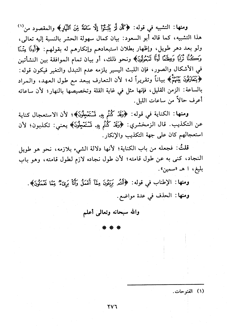 ومنها: التشبيه في قوله: {كَأَنْ لَمْ يَلْبَثُوا إِلَّا سَاعَةً مِنَ النَّهَارِ} والمقصود من (¬1) هذا التشبيه، كما قاله أبو السعود: بيان كمال سهولة الحشر بالنسبة إليه تعالى، ولو بعد دهر طويل، وإظهار بطلان استبعادهم وإنكارهم له بقولهم: {أَإِذَا مِتْنَا وَكُنَّا تُرَابًا وَعِظَامًا أَإِنَّا لَمَبْعُوثُونَ} ونحو ذلك، أو بيان تمام الموافقة بين النشأتين في الأشكال والصور، فإن اللبث اليسير يلزمه عدم التبدل والتغير فيكون قوله: {يَتَعَارَفُونَ بَيْنَهُمْ} بيانًا وتقريرًا له؛ لأن التعارف يبعد مع طول العهد، والمراد بالساعة: الزمن القليل، فإنها مثل في غاية القلة وتخصيصها بالنهار؛ لأن ساعاته أعرف حالًا من ساعات الليل.