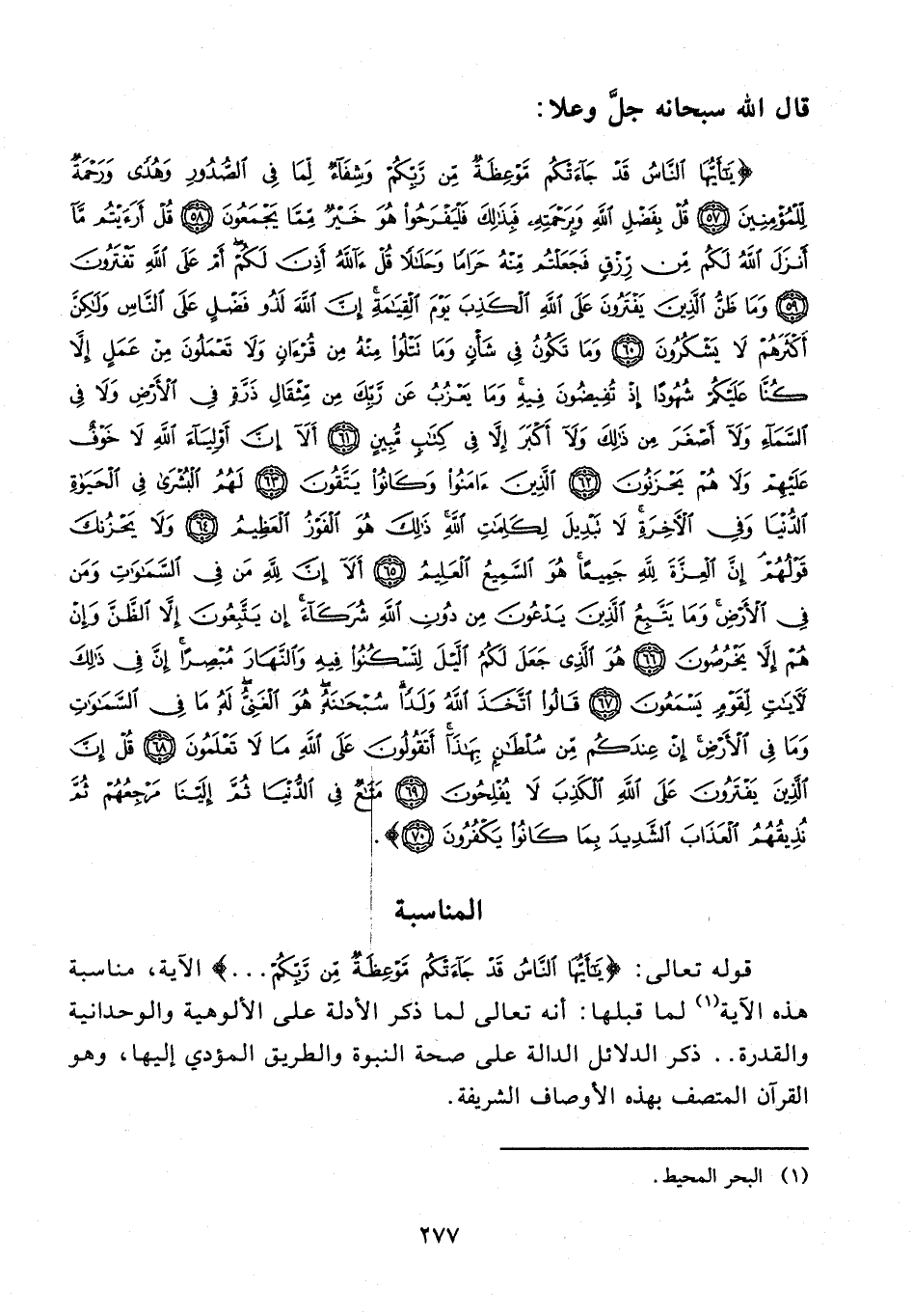 {يَا أَيُّهَا النَّاسُ قَدْ جَاءَتْكُمْ مَوْعِظَةٌ مِنْ رَبِّكُمْ وَشِفَاءٌ لِمَا فِي الصُّدُورِ وَهُدًى وَرَحْمَةٌ لِلْمُؤْمِنِينَ (57) قُلْ بِفَضْلِ اللَّهِ وَبِرَحْمَتِهِ فَبِذَلِكَ فَلْيَفْرَحُوا هُوَ خَيْرٌ مِمَّا يَجْمَعُونَ (58) قُلْ أَرَأَيْتُمْ مَا أَنْزَلَ اللَّهُ لَكُمْ مِنْ رِزْقٍ فَجَعَلْتُمْ مِنْهُ حَرَامًا وَحَلَالًا قُلْ آللَّهُ أَذِنَ لَكُمْ أَمْ عَلَى اللَّهِ تَفْتَرُونَ (59) وَمَا ظَنُّ الَّذِينَ يَفْتَرُونَ عَلَى اللَّهِ الْكَذِبَ يَوْمَ الْقِيَامَةِ إِنَّ اللَّهَ لَذُو فَضْلٍ عَلَى النَّاسِ وَلَكِنَّ أَكْثَرَهُمْ لَا يَشْكُرُونَ (60) وَمَا تَكُونُ فِي شَأْنٍ وَمَا تَتْلُو مِنْهُ مِنْ قُرْآنٍ وَلَا تَعْمَلُونَ مِنْ عَمَلٍ إِلَّا كُنَّا عَلَيْكُمْ شُهُودًا إِذْ تُفِيضُونَ فِيهِ وَمَا يَعْزُبُ عَنْ رَبِّكَ مِنْ مِثْقَالِ ذَرَّةٍ فِي الْأَرْضِ وَلَا فِي السَّمَاءِ وَلَا أَصْغَرَ مِنْ ذَلِكَ وَلَا أَكْبَرَ إِلَّا فِي كِتَابٍ مُبِينٍ (61) أَلَا إِنَّ أَوْلِيَاءَ اللَّهِ لَا خَوْفٌ عَلَيْهِمْ وَلَا هُمْ يَحْزَنُونَ (62) الَّذِينَ آمَنُوا وَكَانُوا يَتَّقُونَ (63) لَهُمُ الْبُشْرَى فِي الْحَيَاةِ الدُّنْيَا وَفِي الْآخِرَةِ لَا تَبْدِيلَ لِكَلِمَاتِ اللَّهِ ذَلِكَ هُوَ الْفَوْزُ الْعَظِيمُ (64) وَلَا يَحْزُنْكَ قَوْلُهُمْ إِنَّ الْعِزَّةَ لِلَّهِ جَمِيعًا هُوَ السَّمِيعُ الْعَلِيمُ (65) أَلَا إِنَّ لِلَّهِ مَنْ فِي السَّمَاوَاتِ وَمَنْ فِي الْأَرْضِ وَمَا يَتَّبِعُ الَّذِينَ يَدْعُونَ مِنْ دُونِ اللَّهِ شُرَكَاءَ إِنْ يَتَّبِعُونَ إِلَّا الظَّنَّ وَإِنْ هُمْ إِلَّا يَخْرُصُونَ (66) هُوَ الَّذِي جَعَلَ لَكُمُ اللَّيْلَ لِتَسْكُنُوا فِيهِ وَالنَّهَارَ مُبْصِرًا إِنَّ فِي ذَلِكَ لَآيَاتٍ لِقَوْمٍ يَسْمَعُونَ (67) قَالُوا اتَّخَذَ اللَّهُ وَلَدًا سُبْحَانَهُ هُوَ الْغَنِيُّ لَهُ مَا فِي السَّمَاوَاتِ وَمَا فِي الْأَرْضِ إِنْ عِنْدَكُمْ مِنْ سُلْطَانٍ بِهَذَا أَتَقُولُونَ عَلَى اللَّهِ مَا لَا تَعْلَمُونَ (68) قُلْ إِنَّ الَّذِينَ يَفْتَرُونَ عَلَى اللَّهِ الْكَذِبَ لَا يُفْلِحُونَ (69) مَتَاعٌ فِي الدُّنْيَا ثُمَّ إِلَيْنَا مَرْجِعُهُمْ ثُمَّ نُذِيقُهُمُ الْعَذَابَ الشَّدِيدَ بِمَا كَانُوا يَكْفُرُونَ (70)}.